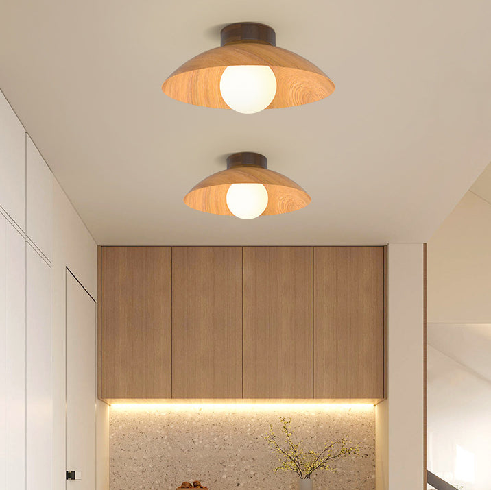 Traditional French Cone Wood Glass Copper 1-Light Semi-Flush Mount Ceiling Light For Living Room