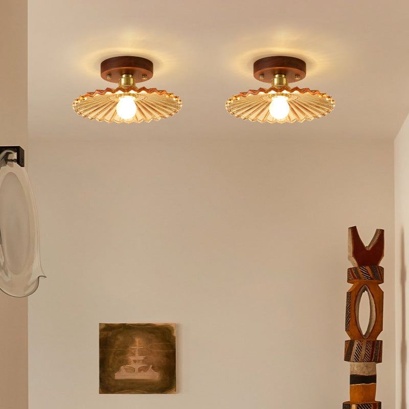 Traditional French Brass Glass Iron Round Folded 1-Light Semi-Flush Mount Ceiling Light For Hallway