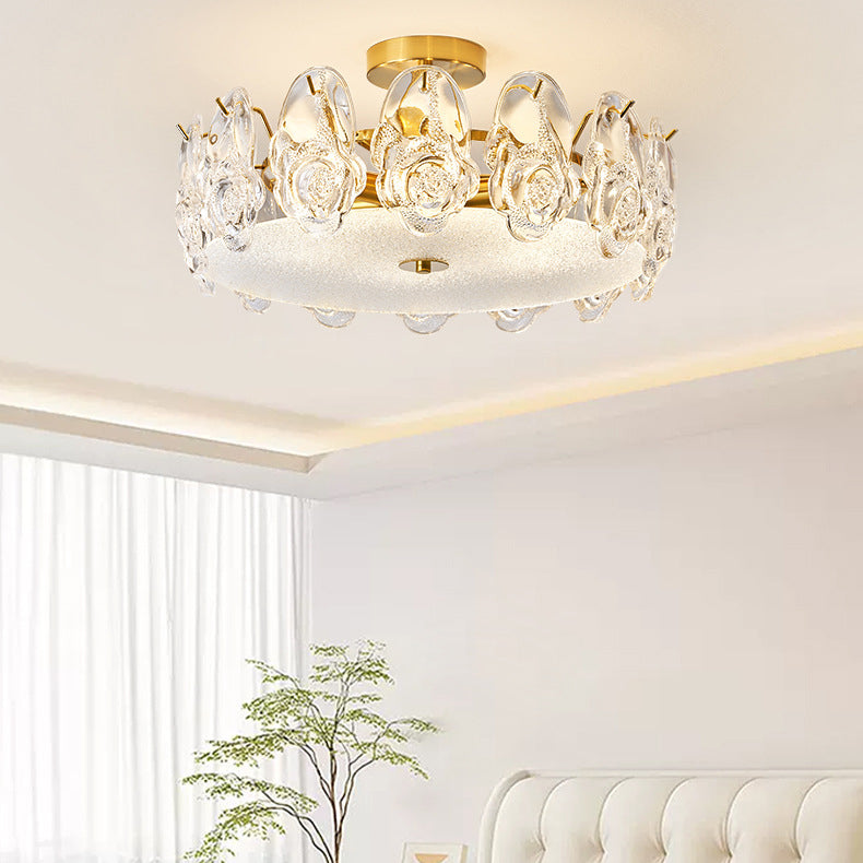 Traditional French Metal Glass Round Rose Frosted 6/8 Light Semi-Flush Mount Ceiling Light For Bedroom