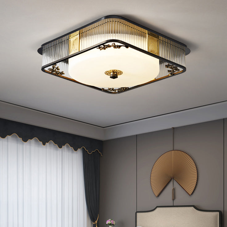 Traditional Chinese Round Copper Stainless Steel Glass LED Flush Mount Ceiling Light For Bedroom