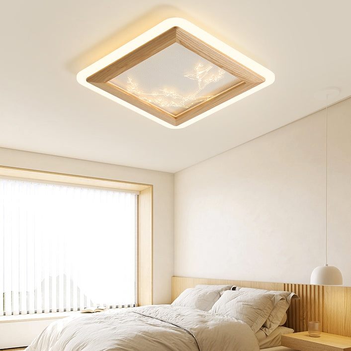 Traditional Japanese Ash Wood Acrylic Round Square Flower Branch LED Flush Mount Ceiling Light For Bedroom