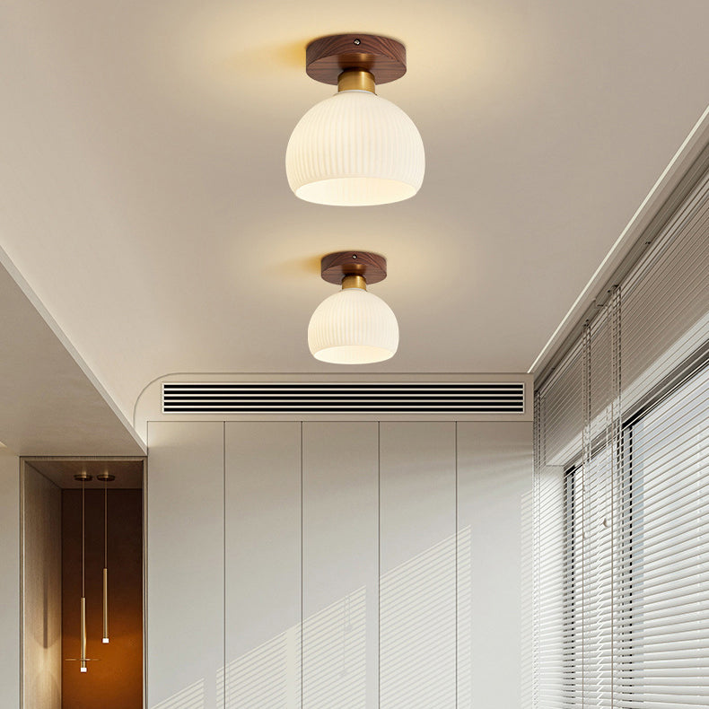 Contemporary Retro Walnut Metal Glass Bowl Round 1-Light Semi-Flush Mount Ceiling Light For Hallway