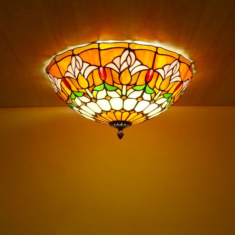 Traditional Tiffany Tulip Stained Glass Iron Dome 2/3-Light Flush Mount Ceiling Light For Living Room