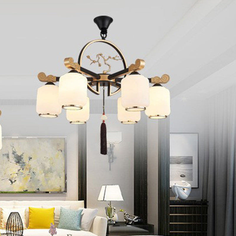 Traditional Japanese Drum Wood Copper Glass 6-Light Chandelier For Living Room