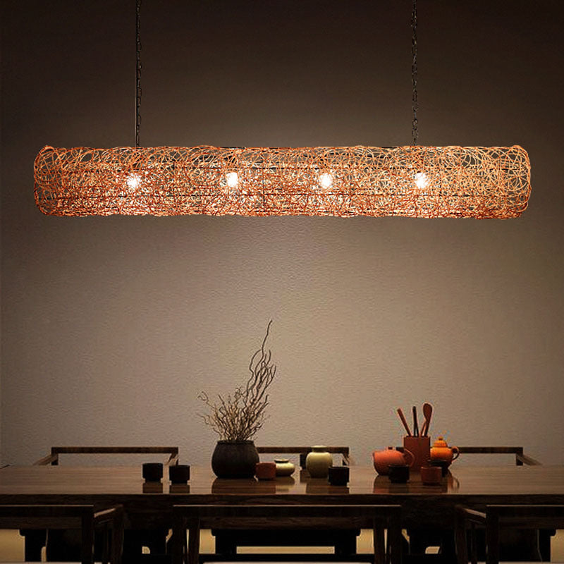 Traditional Japanese Weaving Rattan Metal Cylinder Long Barrel 2/3/4/6/7/9 Light Chandeliers Island Light For Dining Room