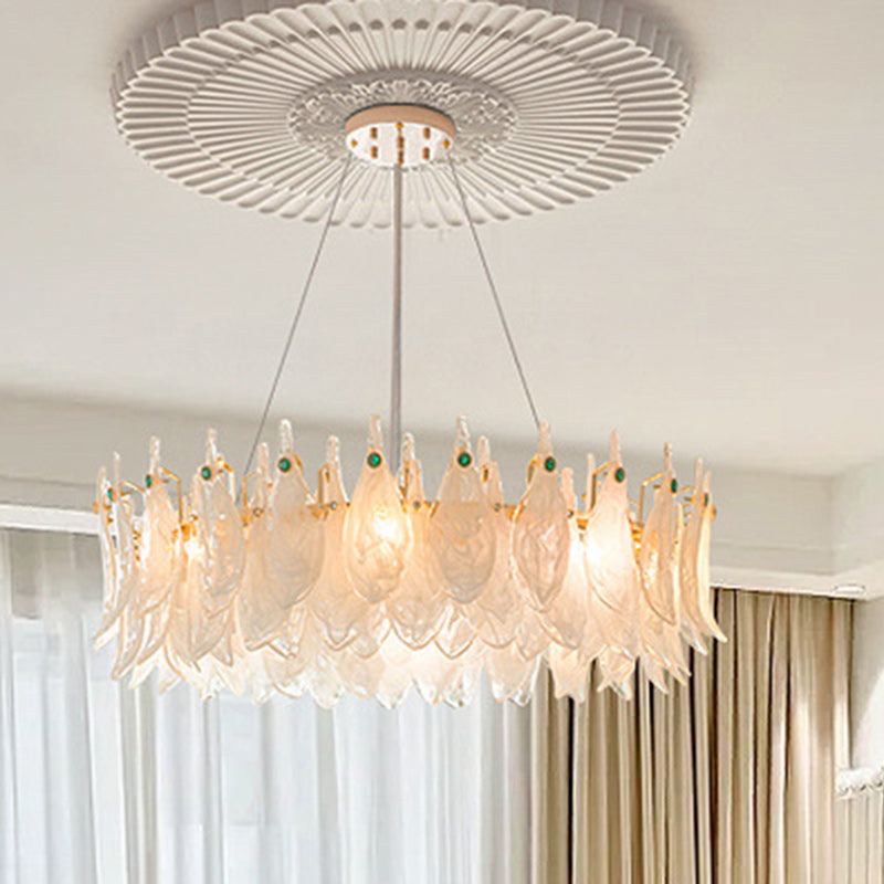 Traditional French Iron Cloudy Glass Leaves Shade Gemstone Decor 5/6/8-Light Chandelier For Living Room