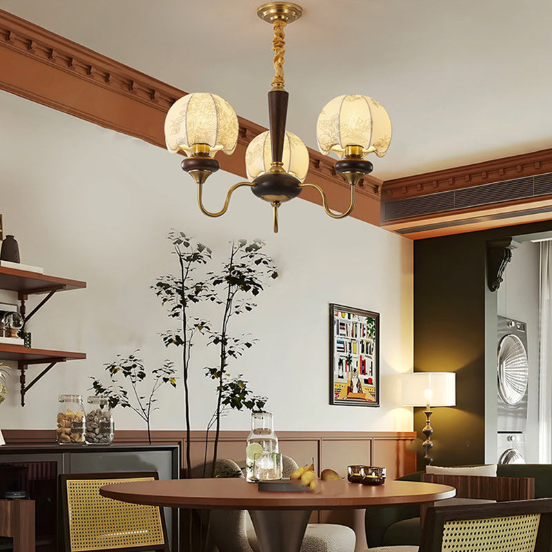 Traditional Japanese Bowl Round Glass Copper 3-Light Chandelier For Living Room