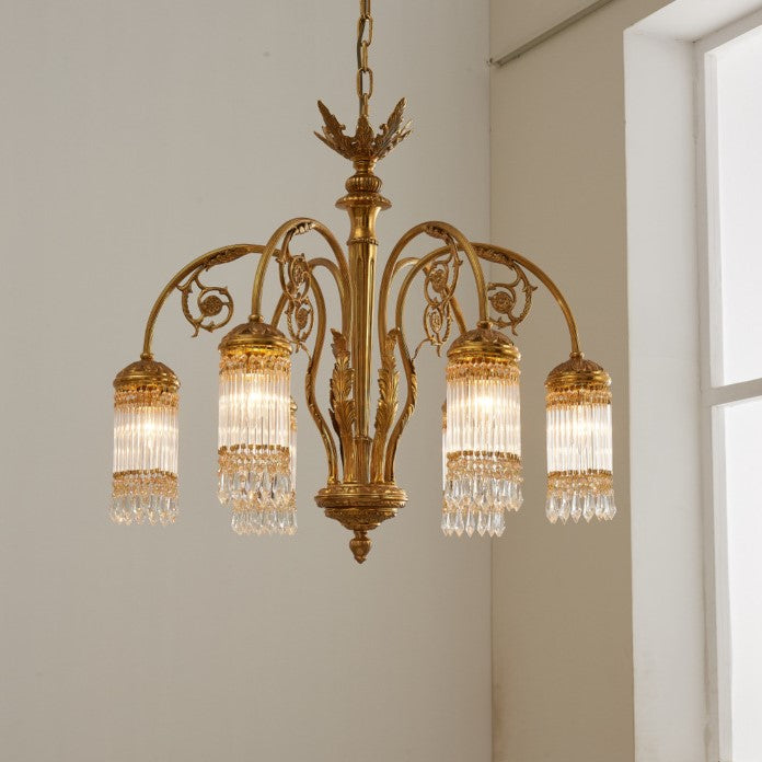 Traditional Vintage Cylinder Branch Feather Copper Glass Crystal 6-Light Chandelier For Living Room