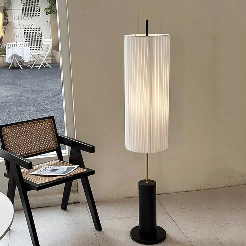 Traditional Japanese Iron Fabric Cylinder Pleated 1-Light Standing Floor Lamp For Living Room