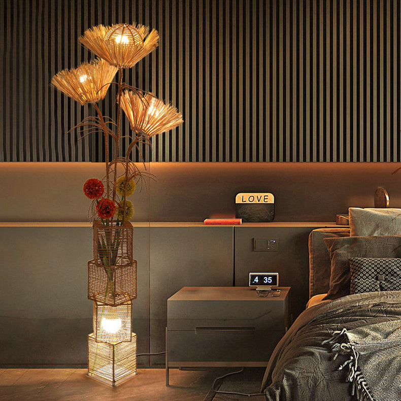 Traditional Japanese Plant Decoration Rattan Weaving Square Shade 1-Light Standing Floor Lamp For Living Room
