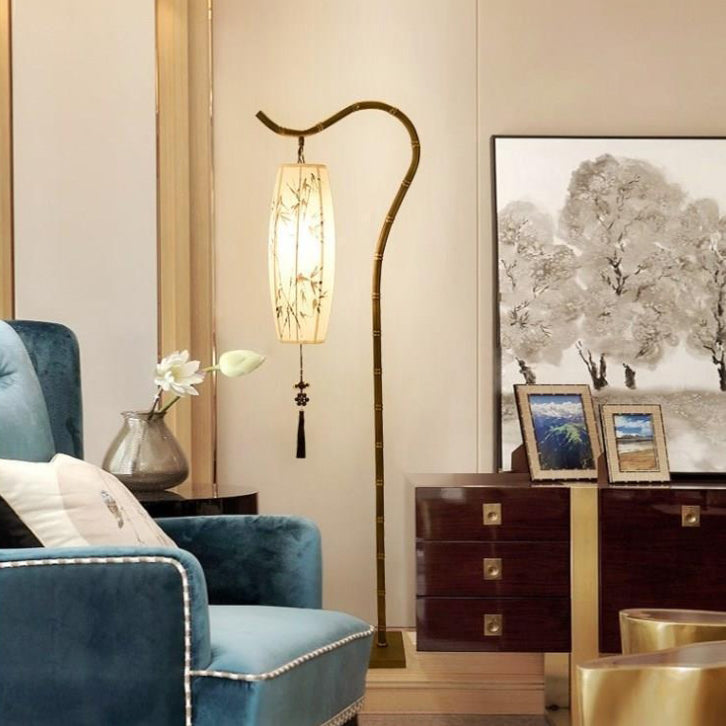 Traditional Chinese Fishing Rod Rectangular Lantern Bamboo Patterned Fabric Iron 1-Light Standing Floor Lamp For Living Room