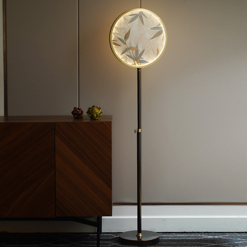 Traditional Chinese Brass Marble Glass Glaze Round Handmade Painted Bamboo Leaves LED Standing Floor Lamp Adjustable For Living Room