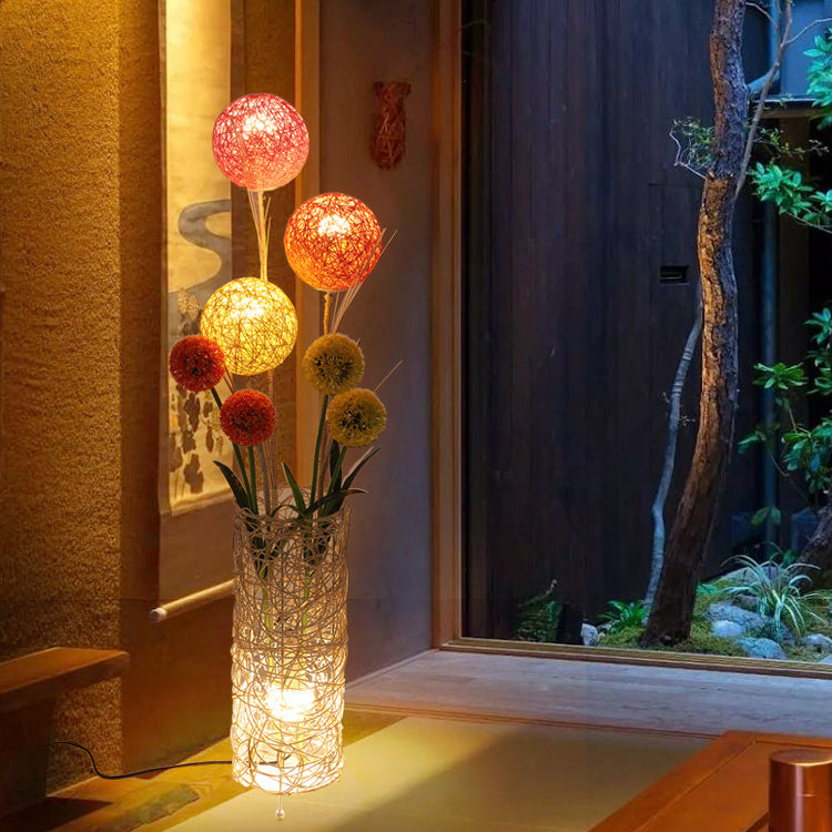 Traditional Japanese Plant Decoration Rattan Weaving Cylindrical Shade 1-Light Standing Floor Lamp For Living Room