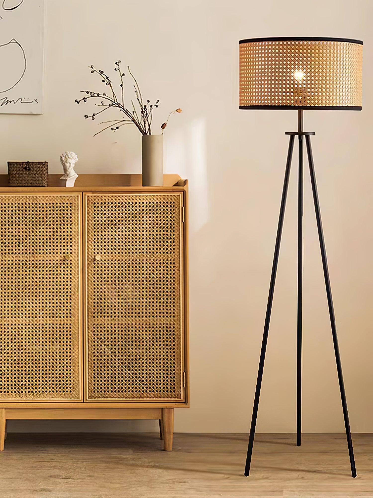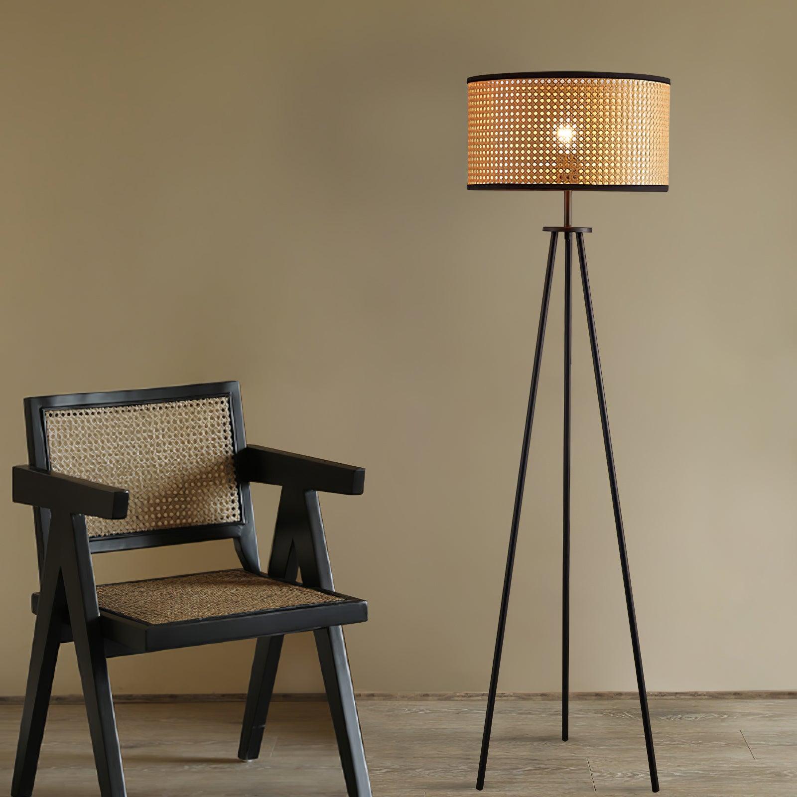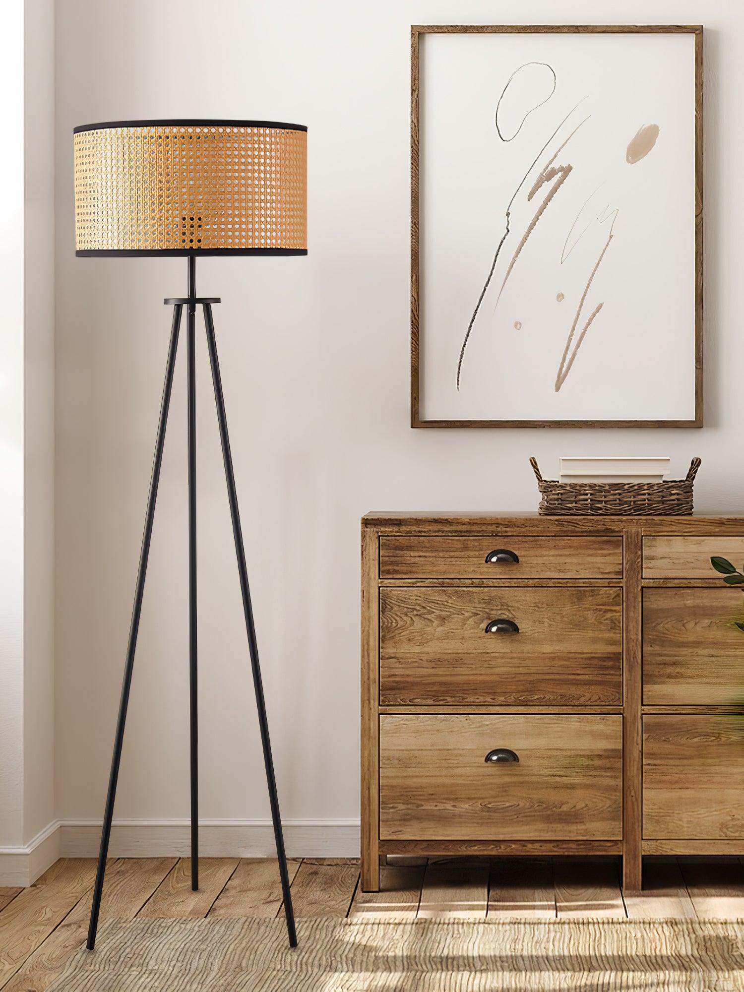 The Aubrey Floor Lamp is expertly designed with a natural color bamboo shade and black edge detailing. It includes three sturdy black-finished metal legs for a modern yet timeless look. Enjoy bright, warm lighting in any room.