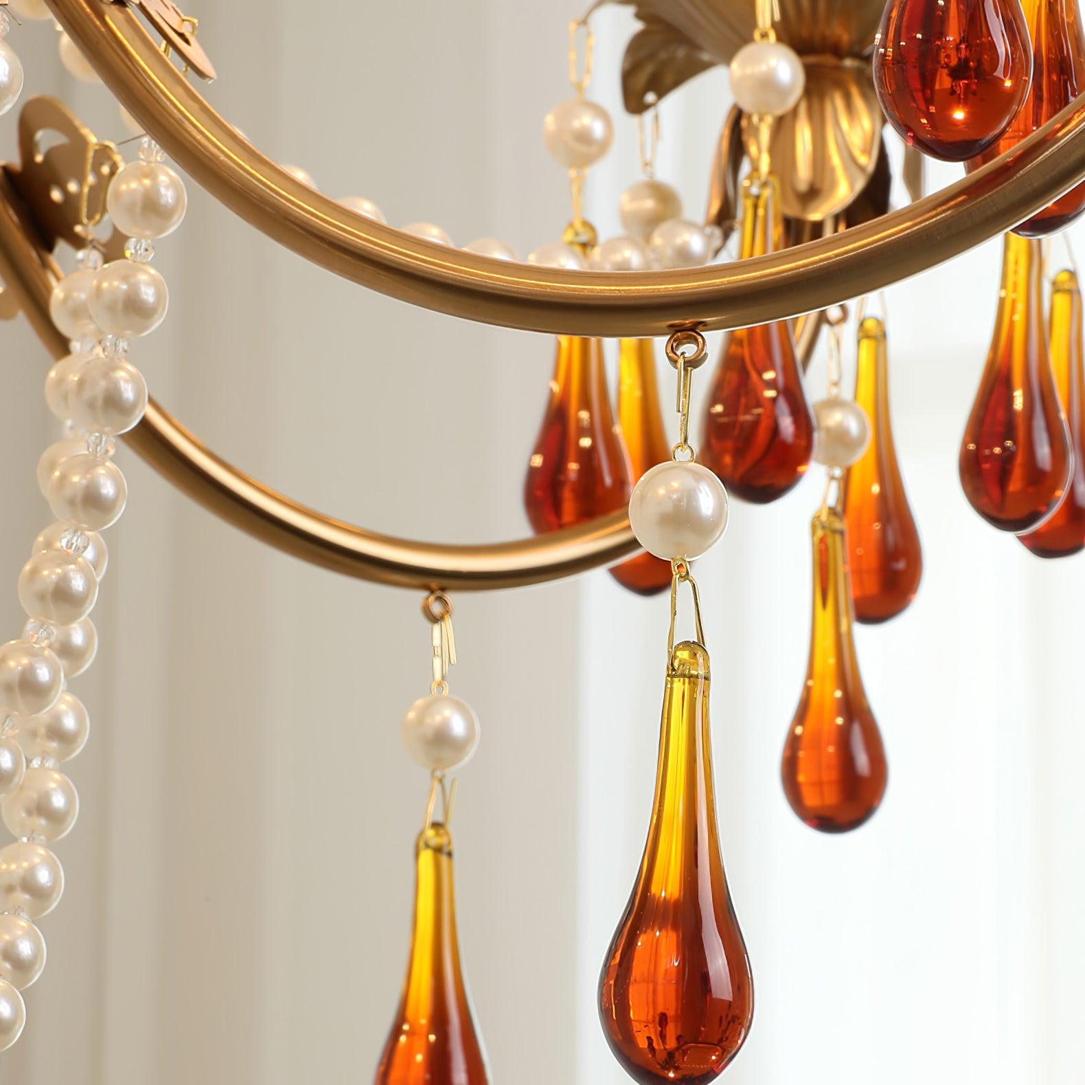 Each branch of this exquisite fixture cradles amber-colored crystal pendants, reminiscent of ripe fruits glistening under the sun's farewell kiss. The crystals scatter a harvest of light across the room, creating an ambiance of warmth and abundance.