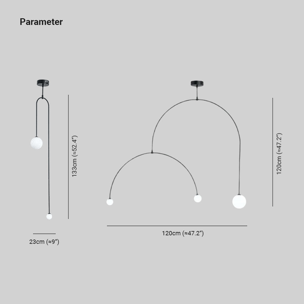 The pendant light is available in two shapes, one with two simple lines forming two arches, and one with only one arch, but with asymmetrical left and right ends. At the ends of the frame are the round shades, the overall artistic beauty of the geometric lines.