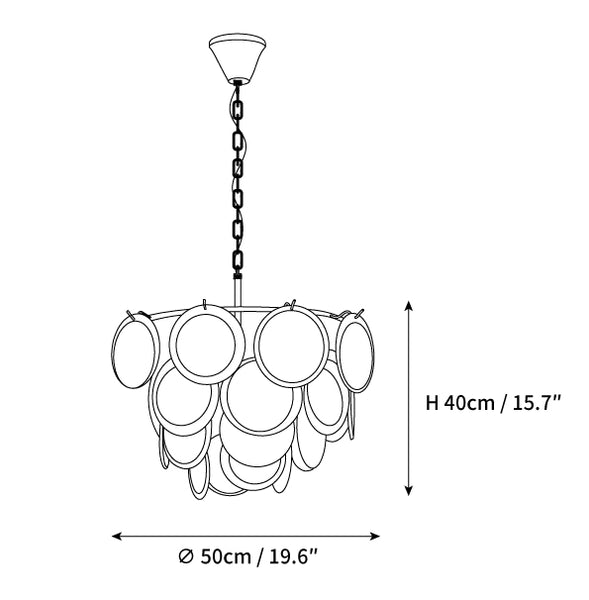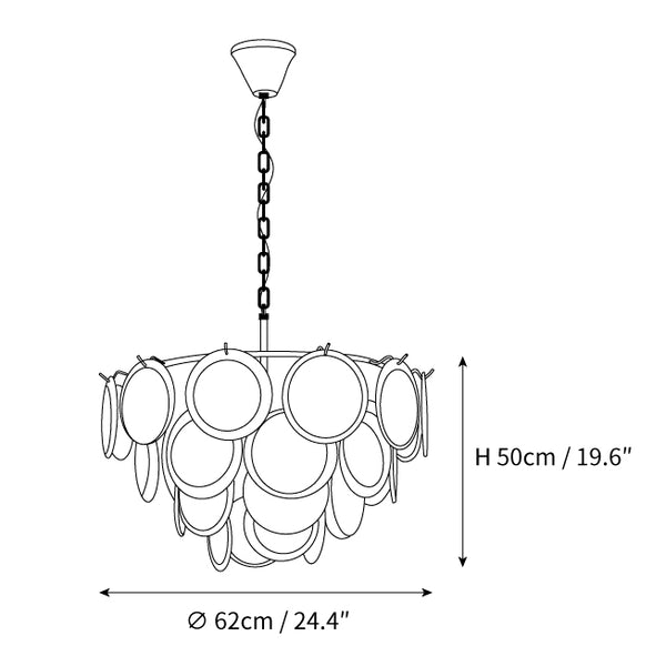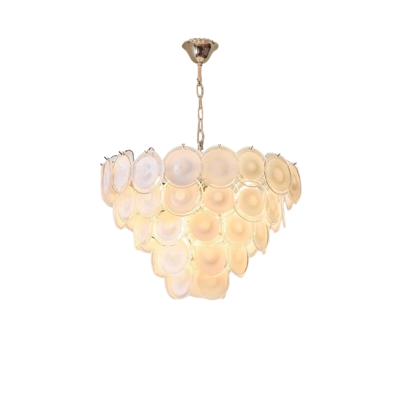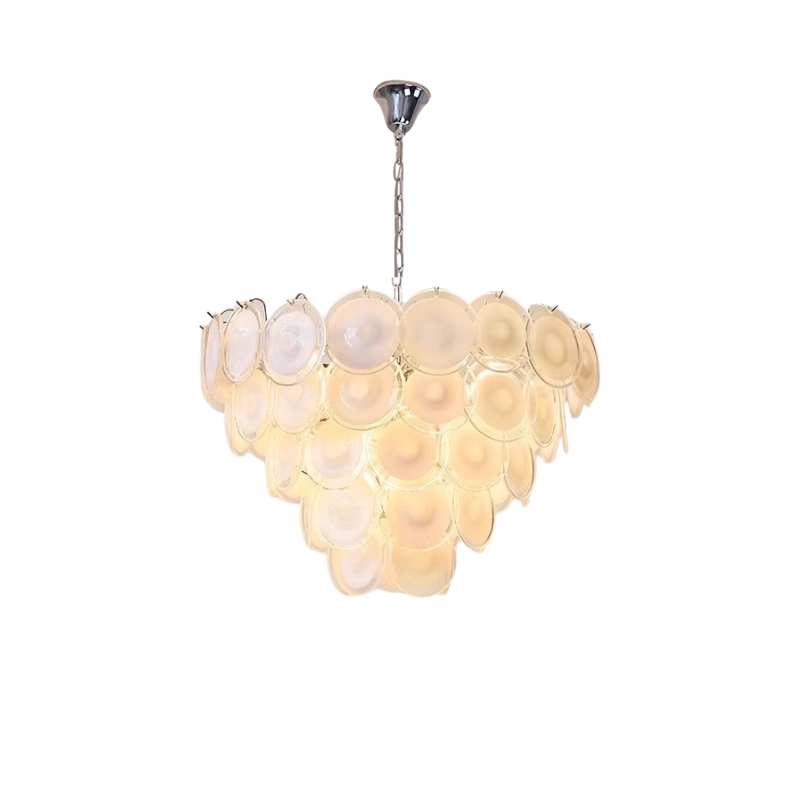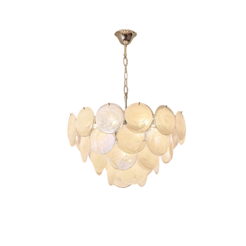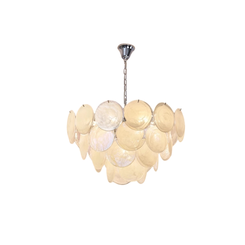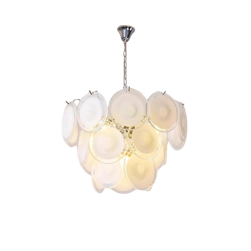 The Bettina Murano Chandelier is a luxurious lighting piece to bring a touch of sophistication to any room. The white, softly glowing glass discs create a warm and inviting ambiance. An ideal choice for elegant home decor.