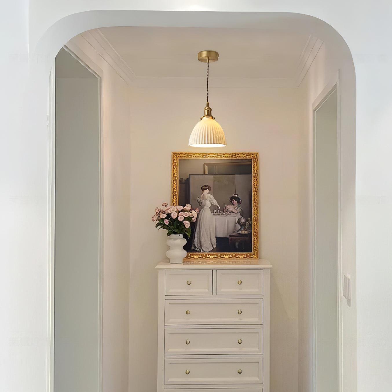 This unique pendant lamp features a pleated brass plated ceramic shade, creating a luxurious yet modern aesthetic. The combination of textures adds an elegant touch to any room, making it a perfect centerpiece for your home.