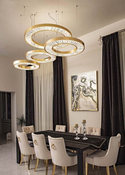 Forged steel rings with different sizes and made to measure tailoring as a high fashion dress . The designer imagination can count on the size of crystals of exceptional beauty. It’s WATER CRISTAL that illuminated by indirect light of the LEDs create an unique effect.WATER CRYSTAL effect arises from the experimentation of Marchetti Lab.A special chemical process that traps the water into the crystal, that blown with nitrogen crystallizes, creating marvelous effects. The finishes also galvanic brushed satin gold. LED Lighting.
