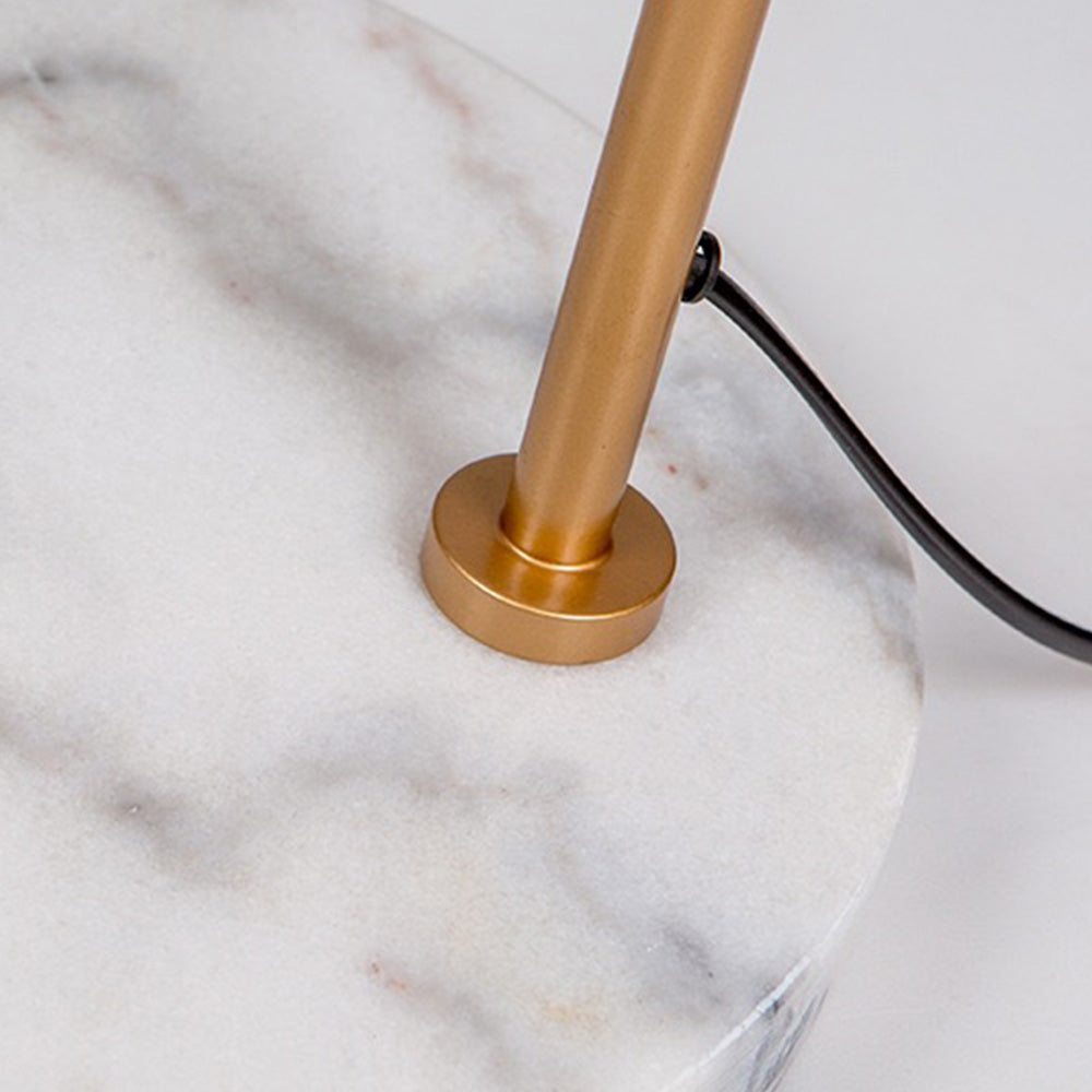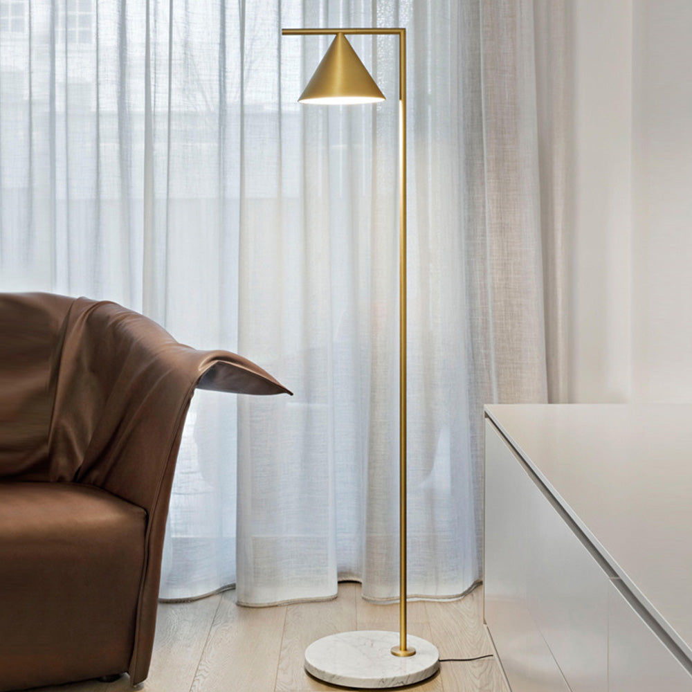 - Its lampshade is made up of geometric cones and the marble base has a clear texture and design.