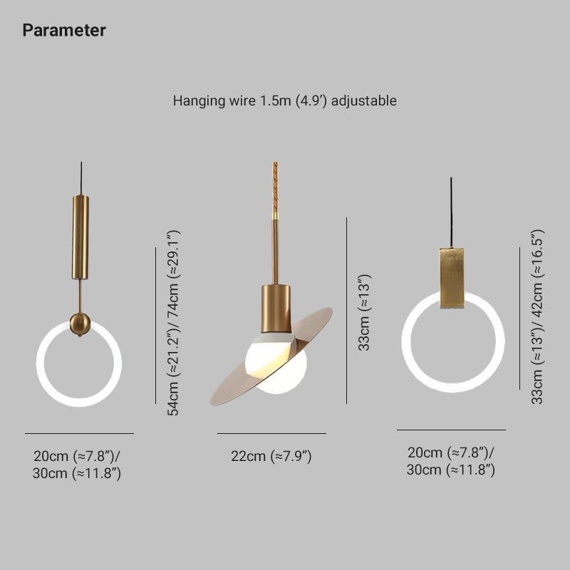 - Golden and black color pendant wire combined with globe and ring shades looks simple and high quality.