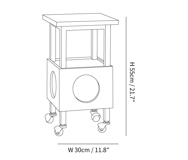 The lamp’s square silhouette, punctuated by circular acrylic windows, radiates a soft, warm light that transforms the ambiance of any room. Its versatility is unmatched; whether serving as a nightstand, side table, or simply as a mobile light source, this piece moves with ease, providing a practical solution for dynamic interior lighting needs. With its practical flat-top surface and open framework, the Cubby Mobile Table Light is not just a lamp but also a piece of interactive furniture designed to adapt and illuminate your living environment.