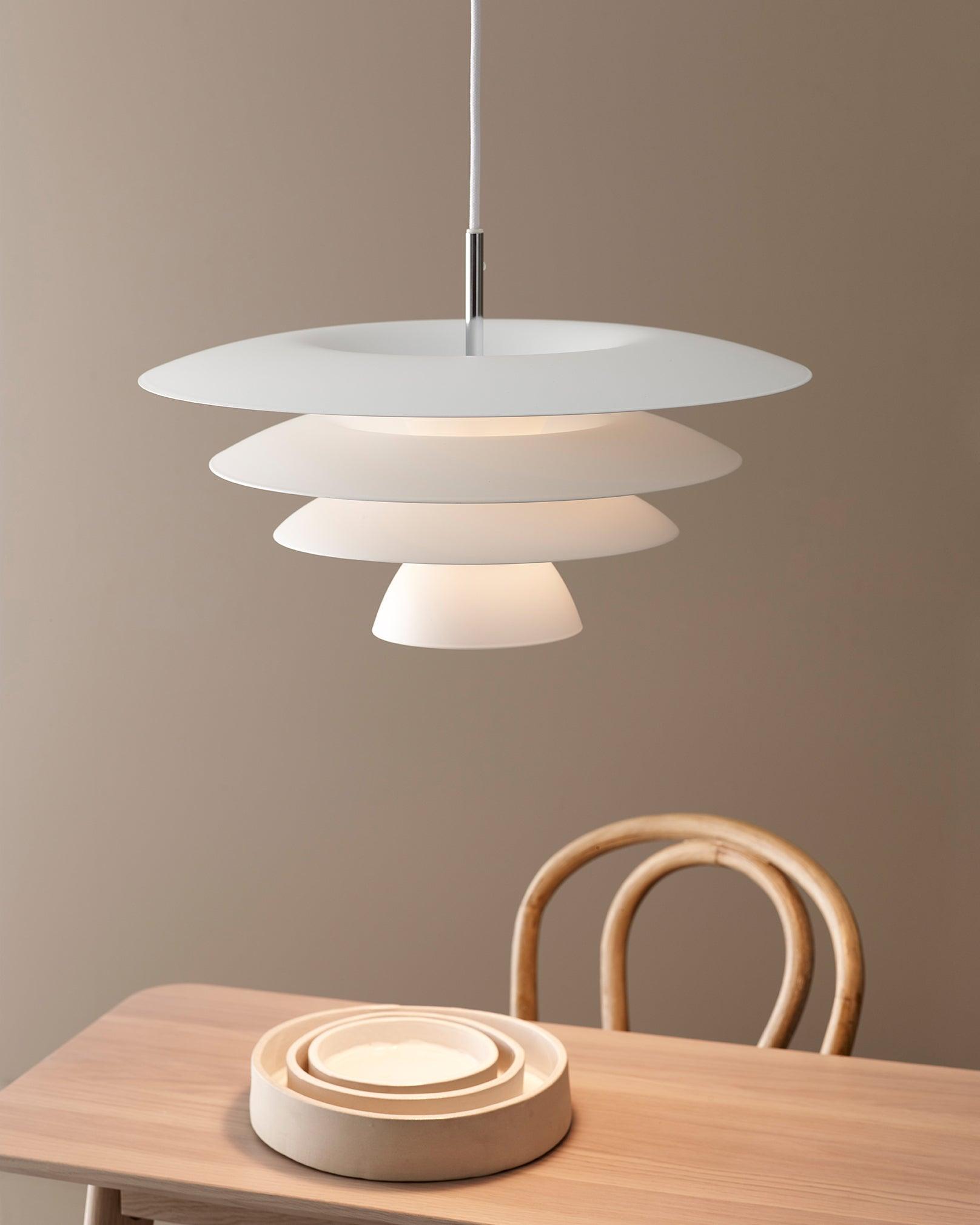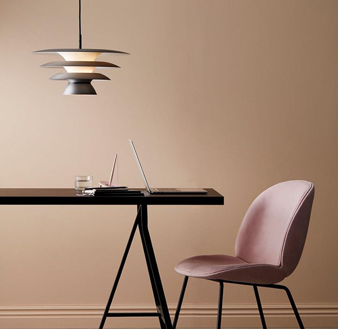 Elegant ceiling pendant from davinci made of metal with beautiful details in chrome. The design of the screen gives the light a pleasant spread where you place it.