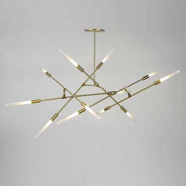 Akin to the intricacies of delicate jewelry, the Dawn chandelier is aesthetically pleasing from every angle and vantage point. Organic feel and sporadic in nature, the fixture gleans a hand-polished finish and the custom hand-blown glass tubes provide perfect soft illumination. This modular system allows the chandelier to articulate and be configured in countless positions, both in horizontal or vertical orientations that suit the spacial needs. The Dawn system is available in 6 - 16 branch configurations, finished in brushed copper, brushed brass or Baking paint black.