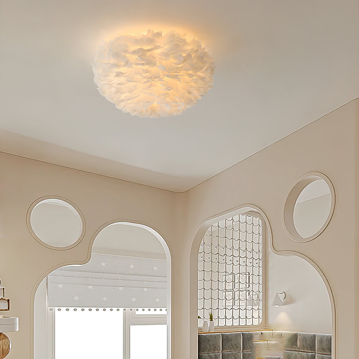 The Feathered Elegance Ceiling Light exudes a soft, ethereal charm with its unique design crafted from delicate goose feathers. This captivating piece diffuses a warm, inviting glow, creating an ambiance of tranquility and sophistication. Perfect for bedrooms, living rooms, or cozy reading nooks, this ceiling light adds a touch of nature-inspired beauty and a sense of calm to any interior space.