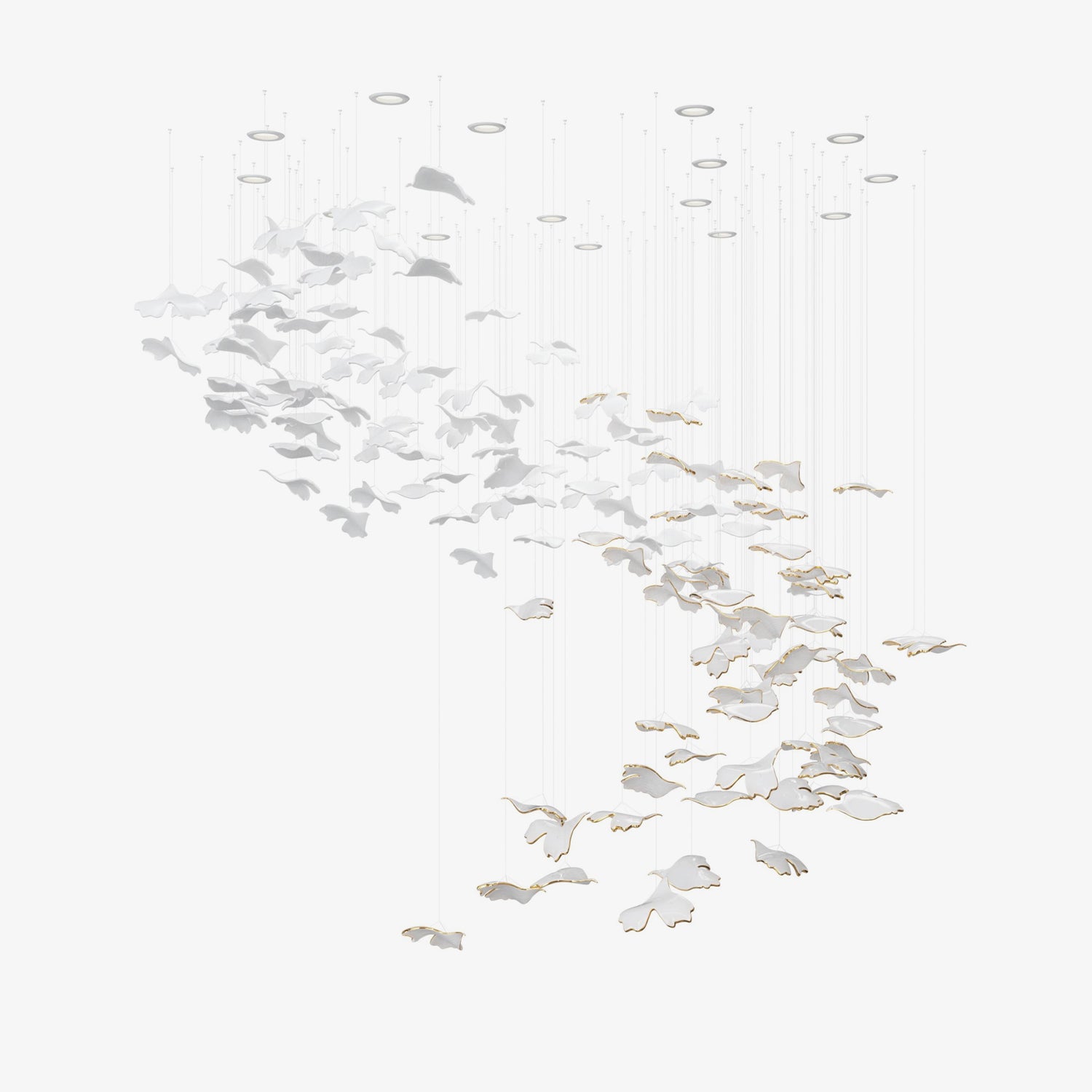 Inspired by the ancient and revered Ginkgo tree, the Ginkgo Aura Collection captures the beauty of nature in a luxurious design. Featuring handblown crystal opal leaves with gilded edges, each piece showcases the iconic fan-shaped foliage of the Ginkgo, adding a touch of elegance to any space. The sandblasted opal and gold finishes create a luminous effect, allowing the lush leaves to radiate a soft glow. The versatile design lets you arrange the leaves in various formations, making it an ideal centerpiece that brings a natural yet sophisticated charm to your interior.Indulge in the luxurious and exclusive Breezeleaf Chandelier. Inspired by the organic artistry of floating leaves, this handblown crystal fixture boasts green and golden hues to elevate any space. Embrace the natural world in your home with customizable formations.