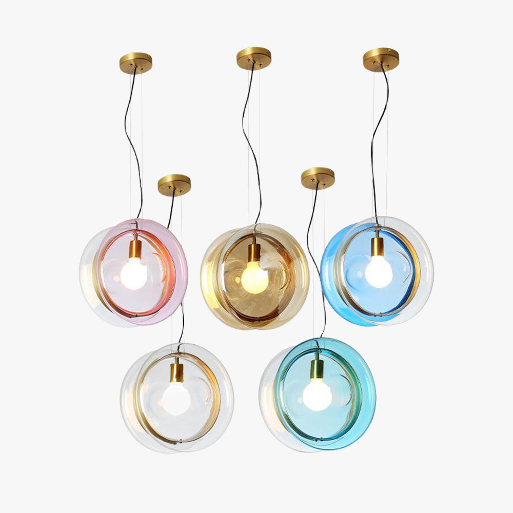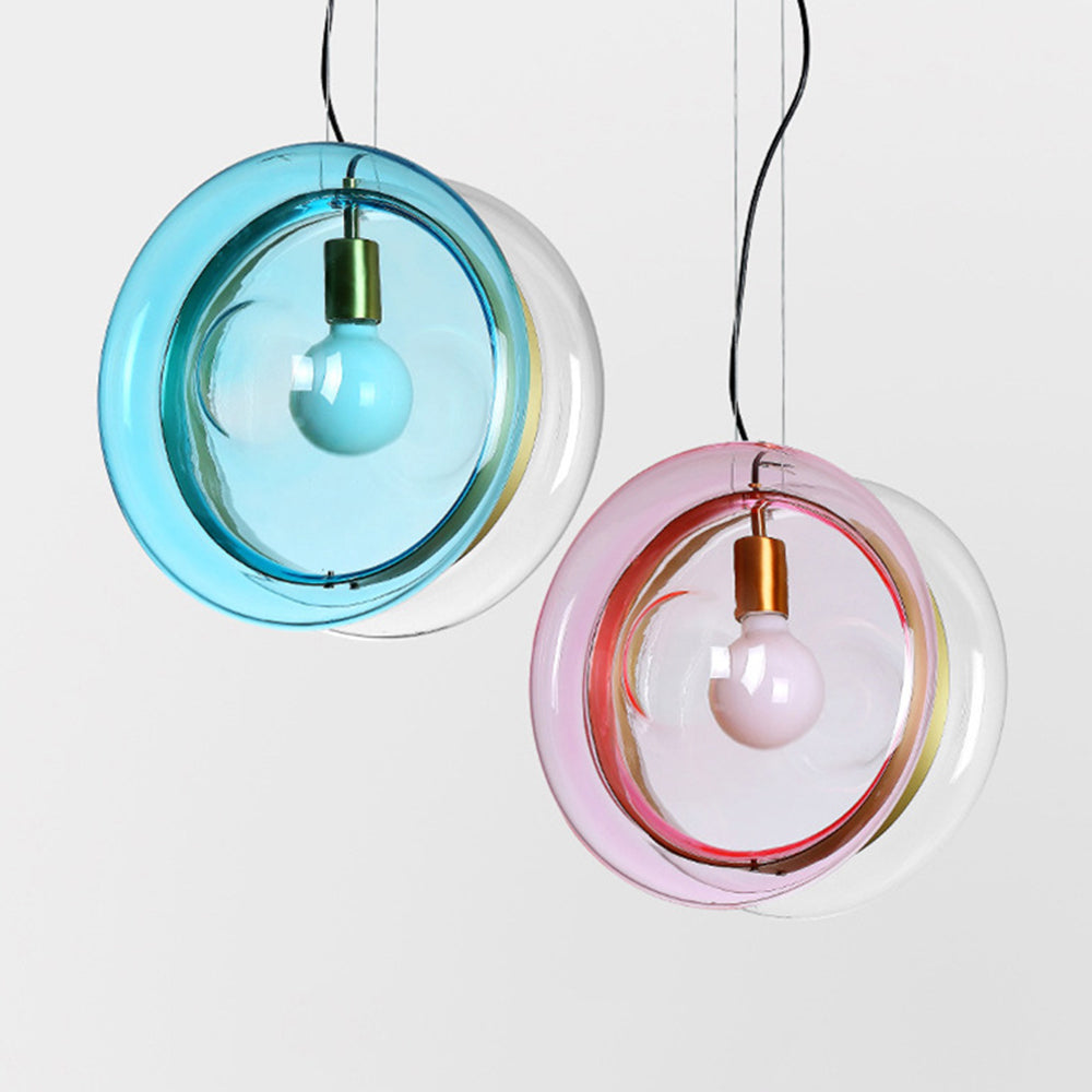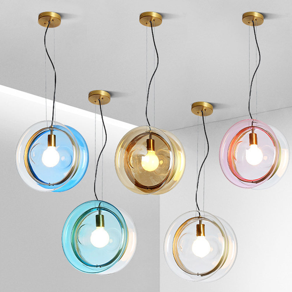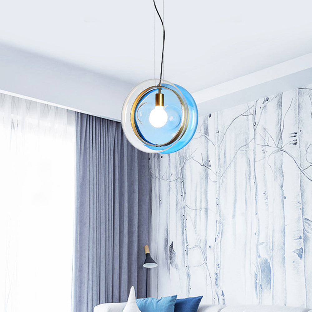 - Rooms equipped with our round art glass pendant lights available in six attractive shades: smoke gray, blue, light blue, pink, amber, and clear. Each shade is carefully designed to complement different environments and evoke a unique emotion or mood. Whether it's a calming cool blue or a warm amber, you can make our pendant lights perfectly match the mood of your room. Choose from warm and white lighting options to further customize the ambiance and create the ideal environment for any occasion.