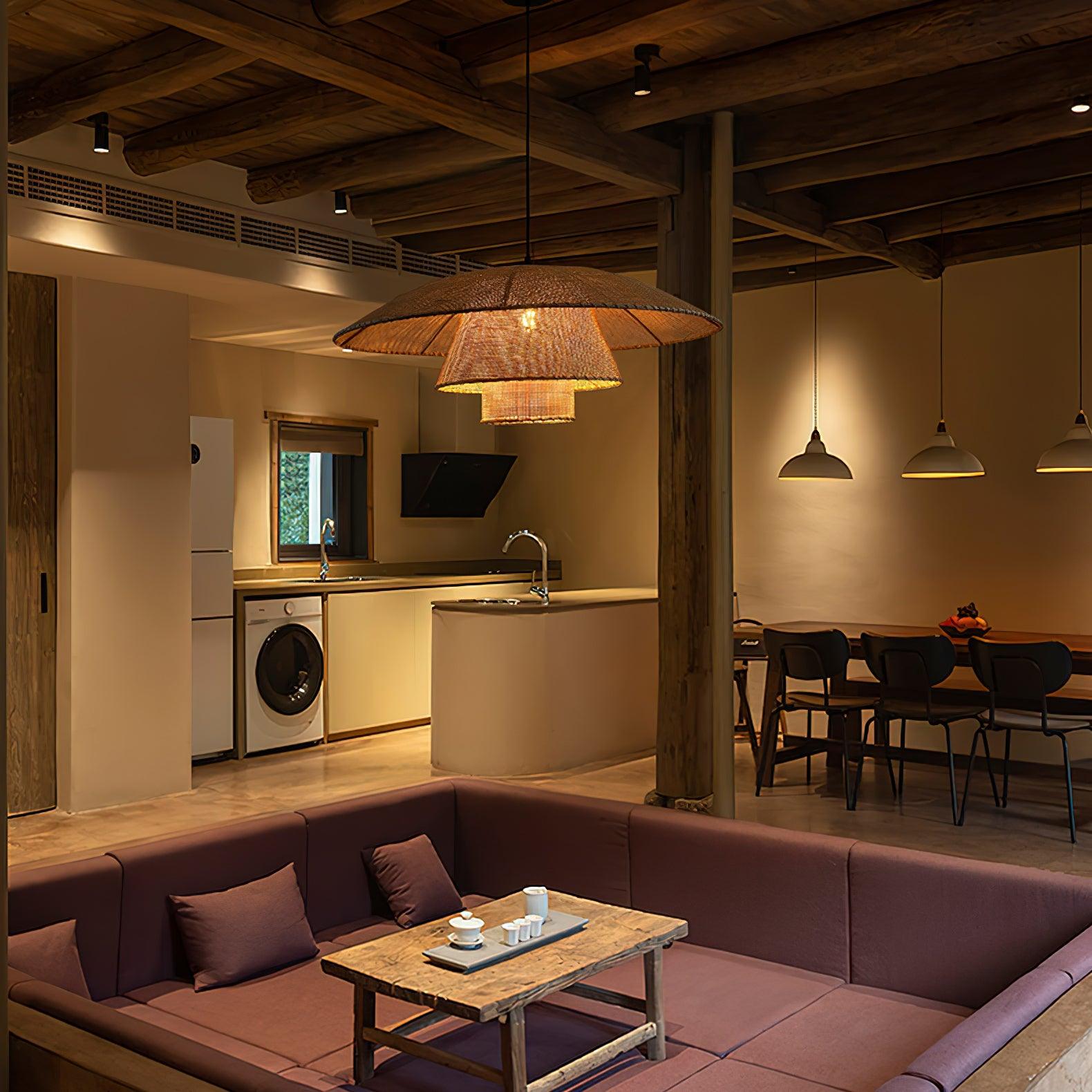 This chandelier marries the earthy texture of hand-woven rattan with the sleek durability of metal, creating a piece that's both playful and refined. The wide brim of the 'hat' is crafted from interlaced rattan, allowing light to peek through and cast a warm, mottled glow that is reminiscent of dappled sunlight through a straw hat. The metal elements provide a contemporary contrast, ensuring that the chandelier holds a sense of balance and modernity.