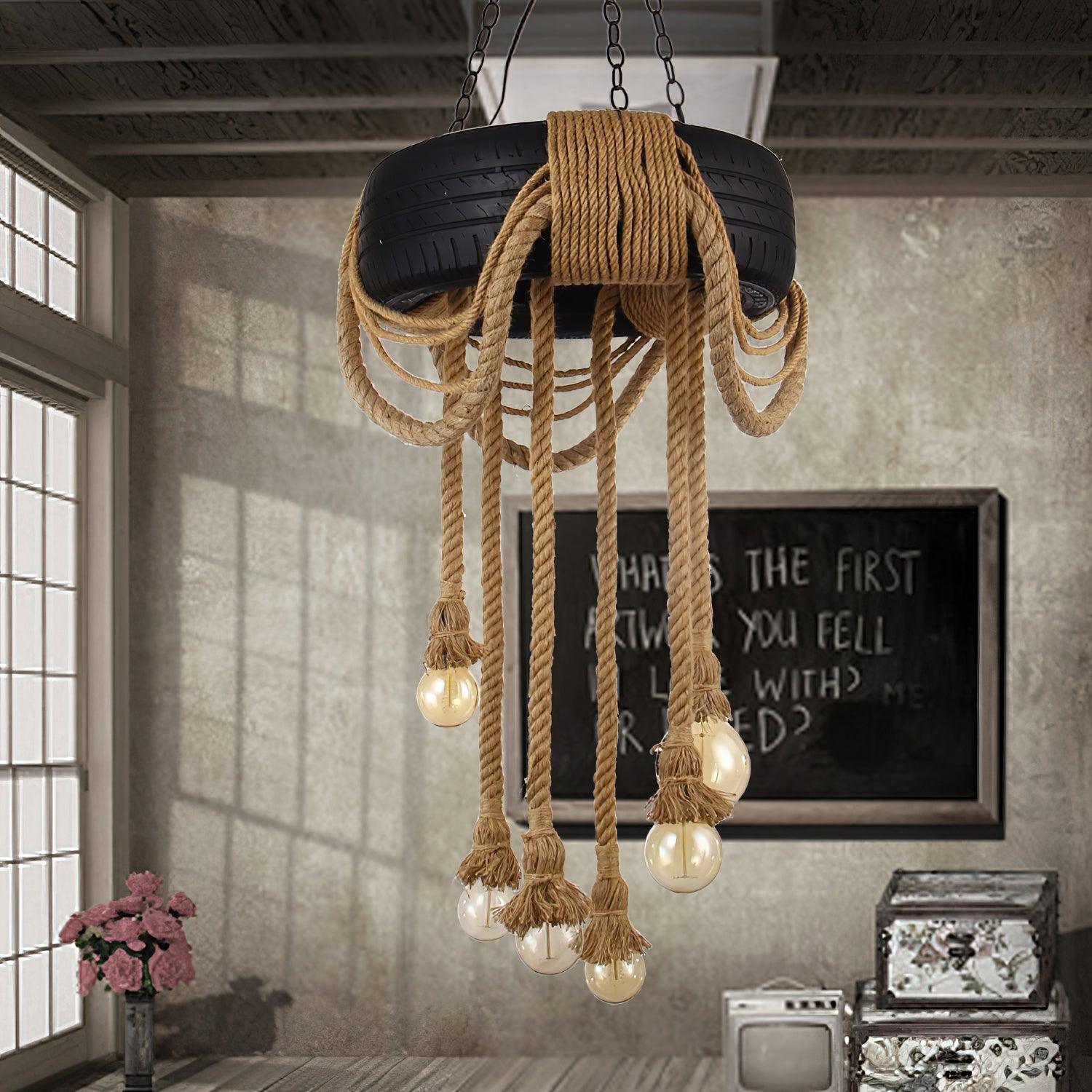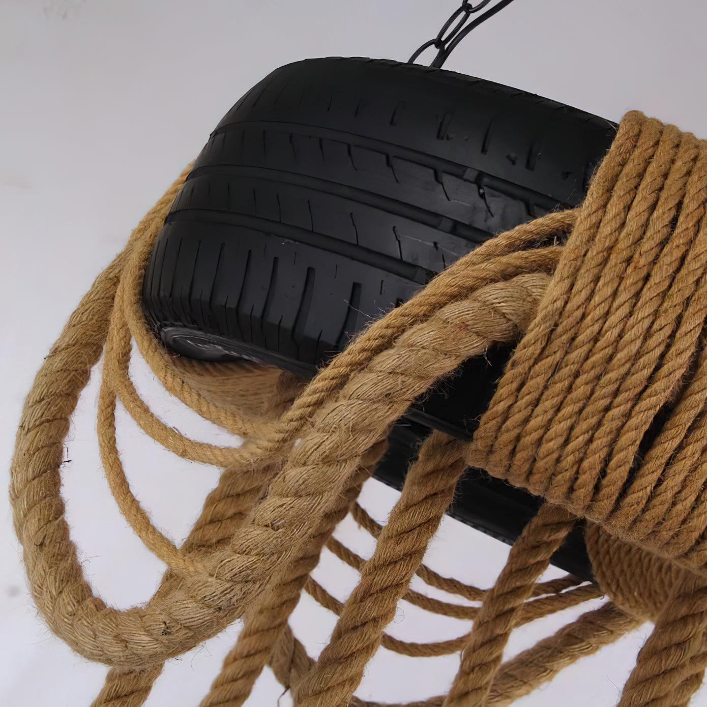 Elevate your space with our Hemp Rope Industrial Tire Chandelier. Handcrafted with natural hemp rope, this industrial retro style chandelier boasts a rich and unique texture. Made from high-quality rubber tires and latex from natural plants, it exudes a pure and natural vibe. Experience the beauty and simplicity of nature in your home!