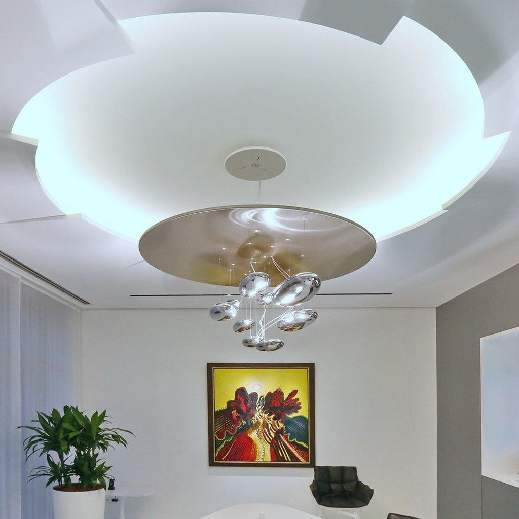 The lamp is available in suspended and ceiling versions. "A ceiling fixture that places floating assemblies of large pebbles beneath a simple modern aluminium disc. These in turn reflect each other, bouncing light between the biomorphic surfaces they teach and their surroundings .