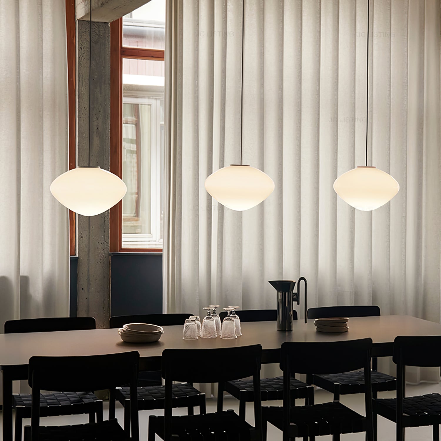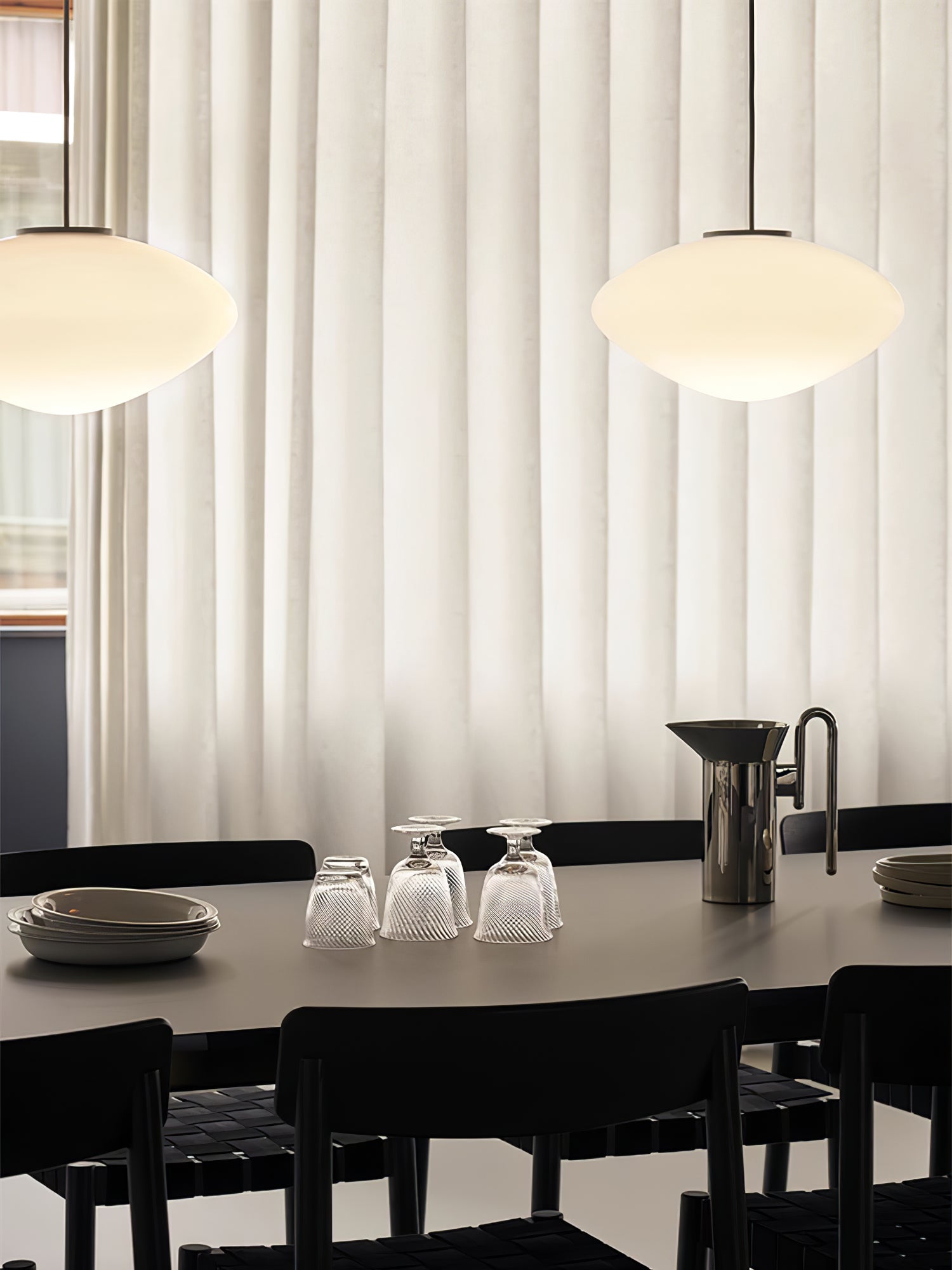 The Mist Pendant Lamp emits diffuse light through its alabaster lampshade, transforming any space into an inviting atmosphere. Its classic shape is enhanced with modern details, including warm aluminum accents. When grouped, it creates stunning light patterns.