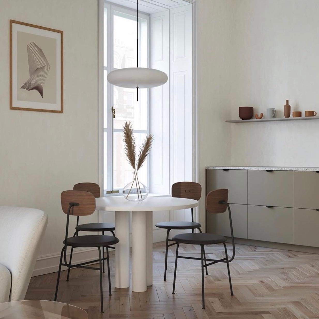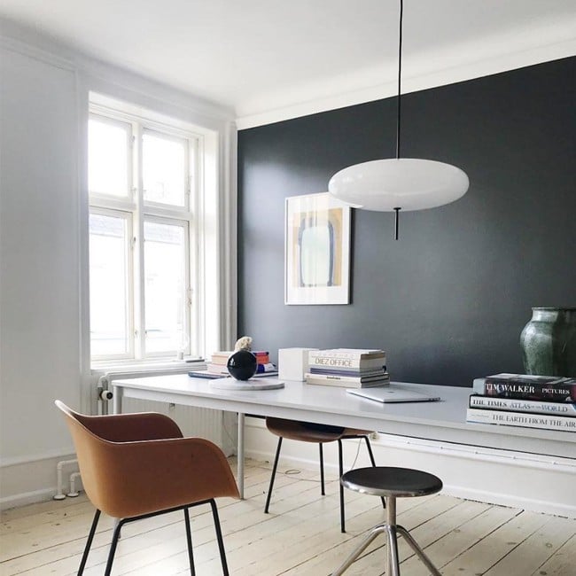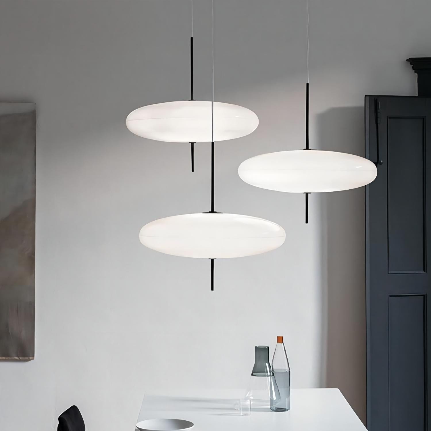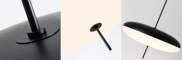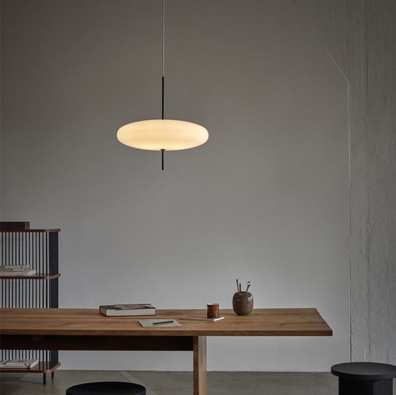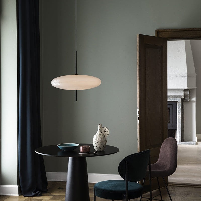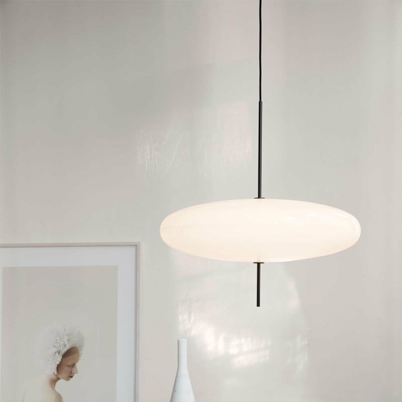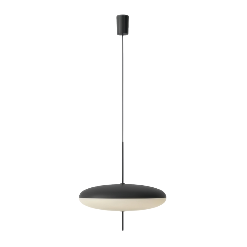 The Model 2065 modern oval pendant light is composed of two joined saucers that merge into a round, flat diffuser. The thin wire and black rod base add a finishing touch to the lamp.The design is simple, creating a sophisticated and seemingly free-floating aesthetic.