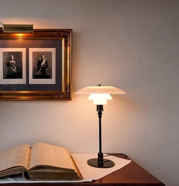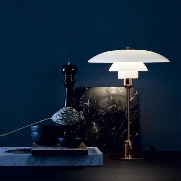 This beautiful PH 3/2 table lamp is made of hand-blown white opal glass shades, which have been sandblasted on the undersides to create unique illumination. The triple downward facing glass shade directs light where it is most needed and creates a soft shadow.