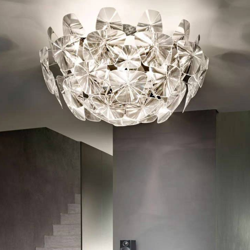 - The Nielsen Design Flush Mount Ceiling Light and fully encapsulates modernism sprinkled with traditional glamour. Sophisticated appearance that is achieved due to the use of metal and clear acrylic combined with round shape are other advantages of the product that allow it to be used in different interior design concepts. It looks great in any house type and design whether in minimalist, industrial, or traditional themed home, in which this ceiling light serves as the perfect addition.