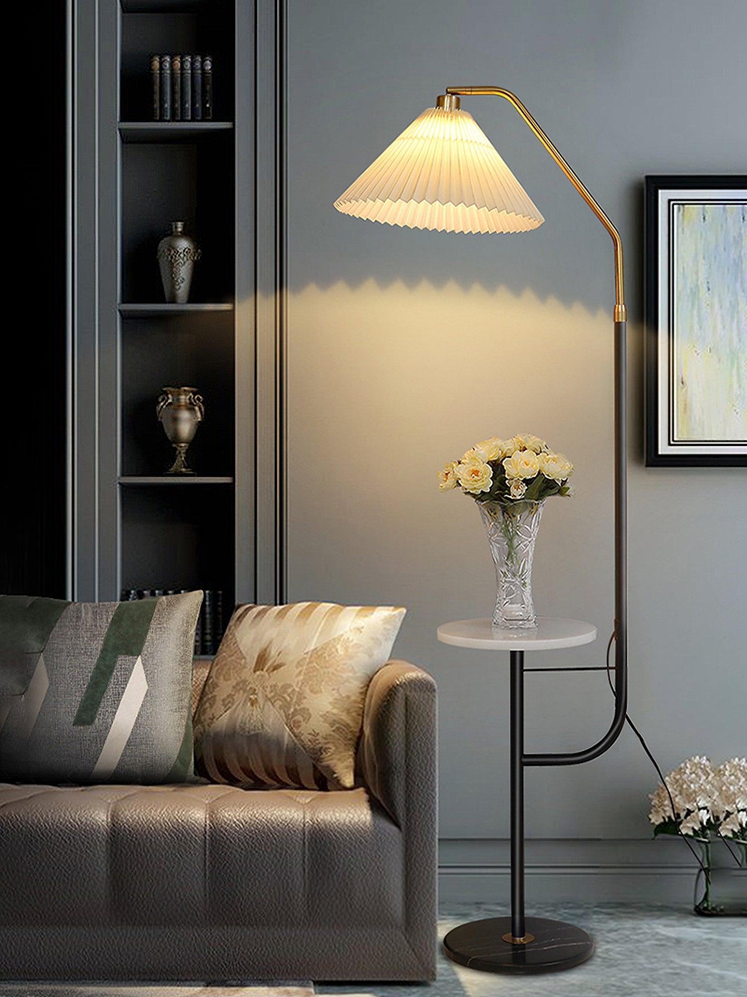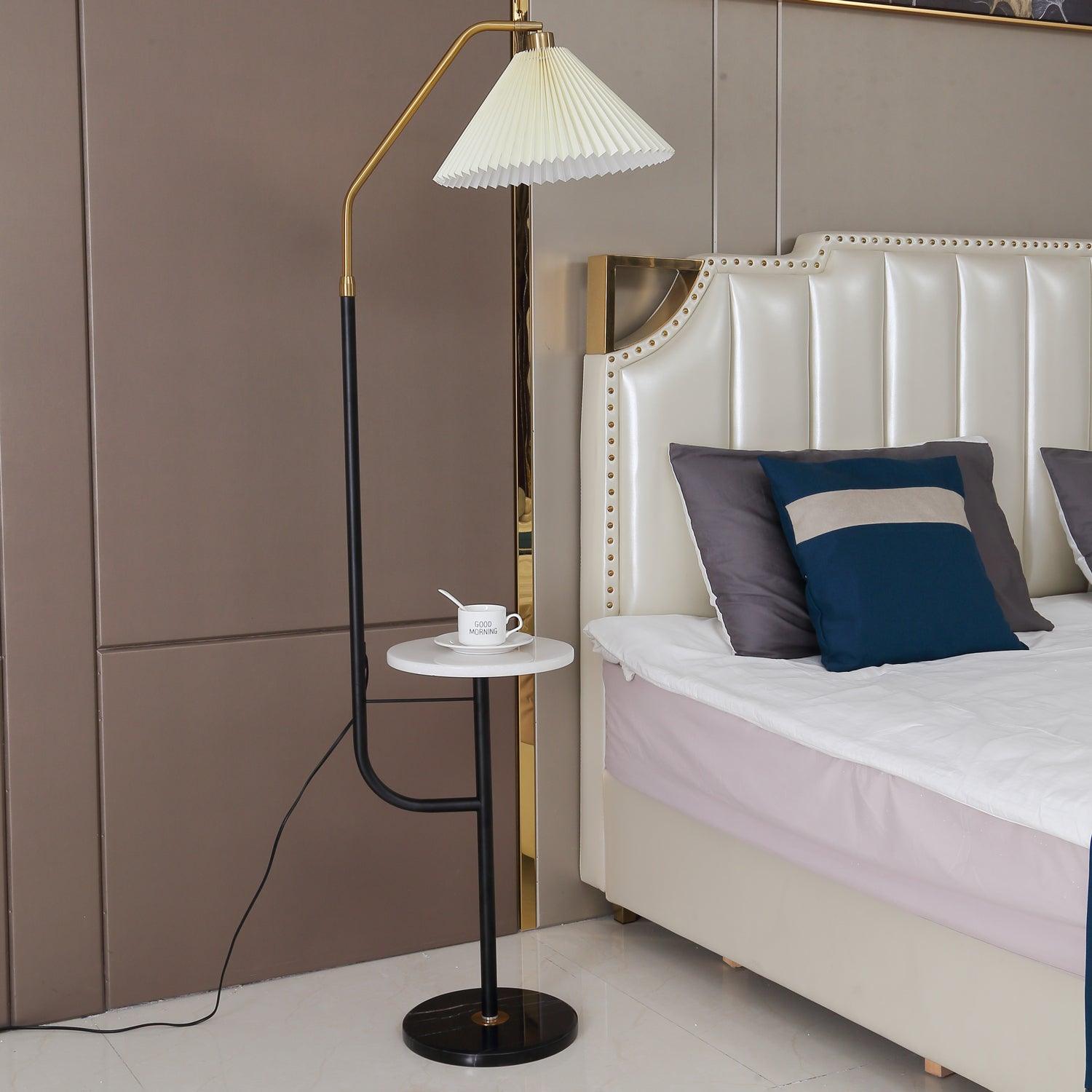 The Ozz Floor Lamp is a stunning lighting fixture that combines metal and marble materials. Its unique design features a blend of gold and black in the lamp body, complemented by beige and green lampshades, adding a touch of fashion and artistic brilliance to your indoor space. Additionally, this floor lamp is equipped with a tray in the middle, making it not only a lighting solution but also a practical and functional home decor piece.