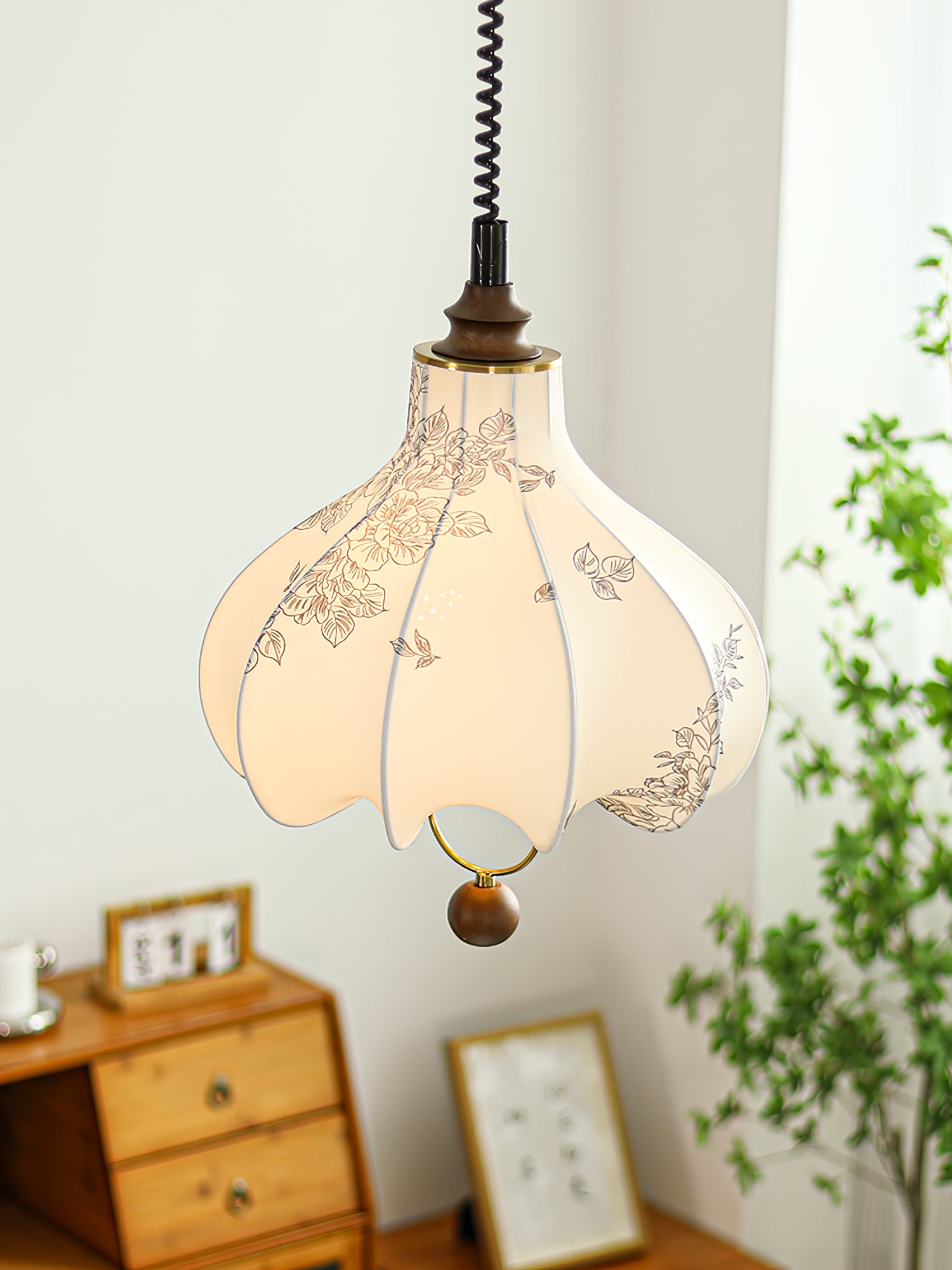 The Pear Fabric Pendant Lamp features a charming pear-shaped design crafted from printed fabric and walnut wood. Its floral fabric shade adds a touch of elegance and nostalgia, while the warm tones of the walnut wood create a cozy atmosphere. Perfect for adding a vintage-inspired yet contemporary accent to any room, this pendant lamp brings a harmonious blend of natural materials and timeless design.