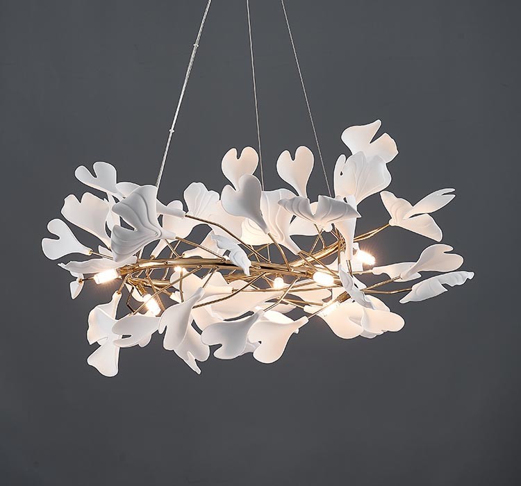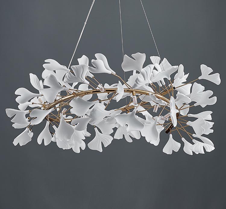 Post-modern PETAL Chandelier features a circle covered with many petals, when seeing it far away as if butterflies danced arounf and formed a ring. It also like falling petals fixed in the air, and this beauty will never pass. This is a flower that will not wither and will always give off fragrance. It embodies the beautiful art. This chandelier uses superb crafts, since it makes the ceramic into a petalled shape. And the petal is very three-dimensional, but also let people feel soft, like a realistic flower. With golden body, the color of petals is white. With warm light, it turns into pale pink like cherry blossoms, which is full of romance and grace.