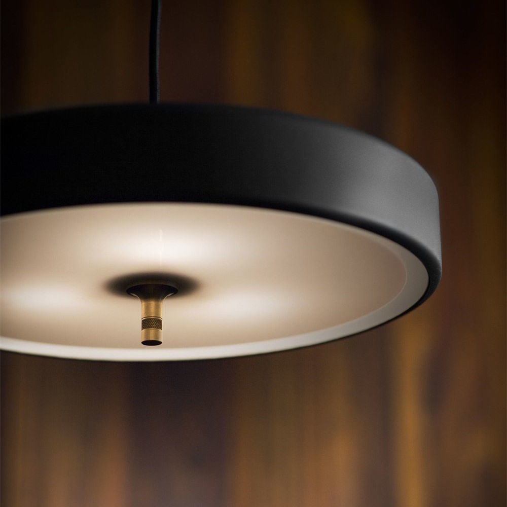 Revolve Pendant Lamp casting a warm glow through its opal glass diffuser, light also escapes through the top brass feature of the Revolve Pendant Lamp, highlighting the elegant, spun metal shade. The Revolve collection is made up of multiple fixtures with very smooth and regular shapes. Born of a know-how of excellence, the Revolve pendant light is made of brass. This noble material, very elegant and in vogue, ensure its quality and its aestheticism within any environment. This light draws you in to imagine all the great possibilities alone it can give, and the pleasure you take from seeing it for yourself. Casting a warm glow through its opal diffuser light also escapes through the top brass feature of the Revolve Pendant Lamp, highlighting the elegant, spun metal shade.