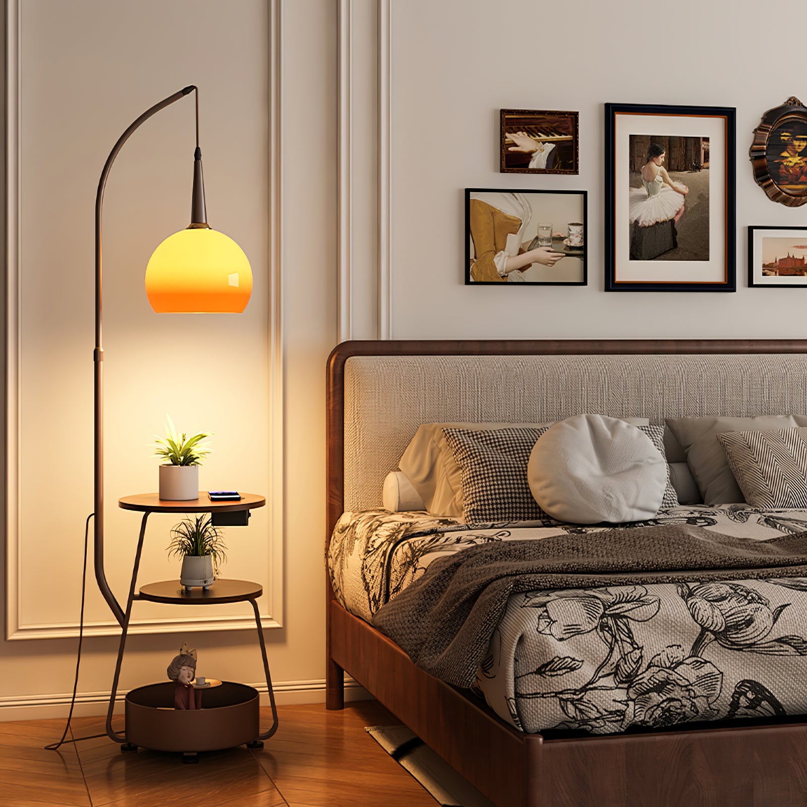 Transform your living space with the elegant Solstice Arc Floor Lamp. Designed with a striking arched frame and a radiant orange gradient globe lampshade, this lamp brings both ambient light and modern style to your home. The integrated dual wooden shelves and a bottom storage tray make it a multifunctional piece, perfect for displaying décor, plants, or storing daily essentials. Ideal for cozy corners, living rooms, or bedrooms, the Solstice Arc Floor Lamp combines contemporary design with practical storage, adding a warm and stylish touch to any setting.
