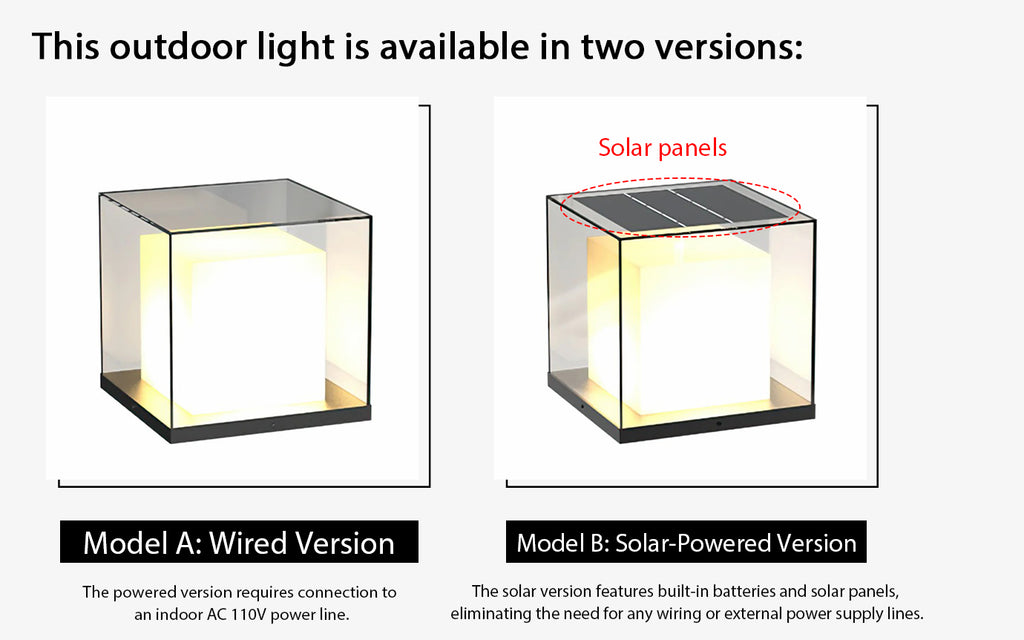 Voltage: AC 110-240V (Wired version) / DC 3.2V (Solar-powered version).