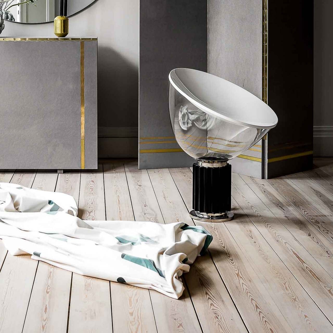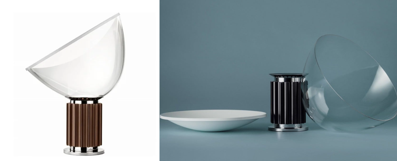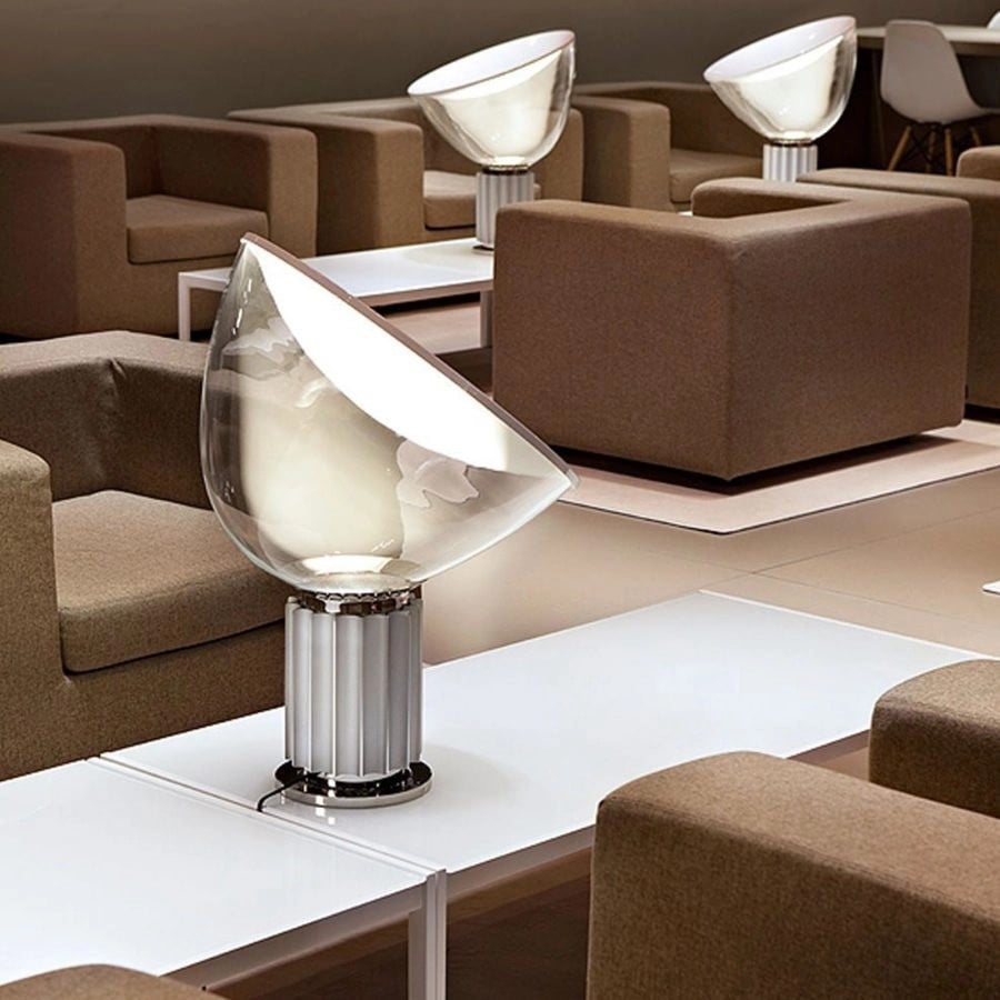 The Taccia Bowl Shape Glass Table Lamp, with its upside-down design, features a painted aluminum reflector and a corrugated base for heat dispersion and glare prevention. Its clear glass bowl diffuses soft, making it a versatile choice for industrial-style interiors.