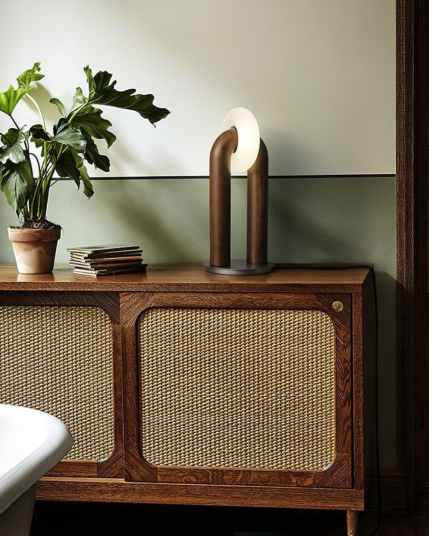 This U-Shaped Xuanguang Table Lamp is both beautiful and practical. It features a Tianmen Xuanguang, an acrylic lampshade, a metal base to enhance load-bearing capacity, and a solid wood lamp body with whole wood carving natural texture. It has a touch switch for easy use and an optical light guide for a soft and natural glow. An excellent combination of form and function.