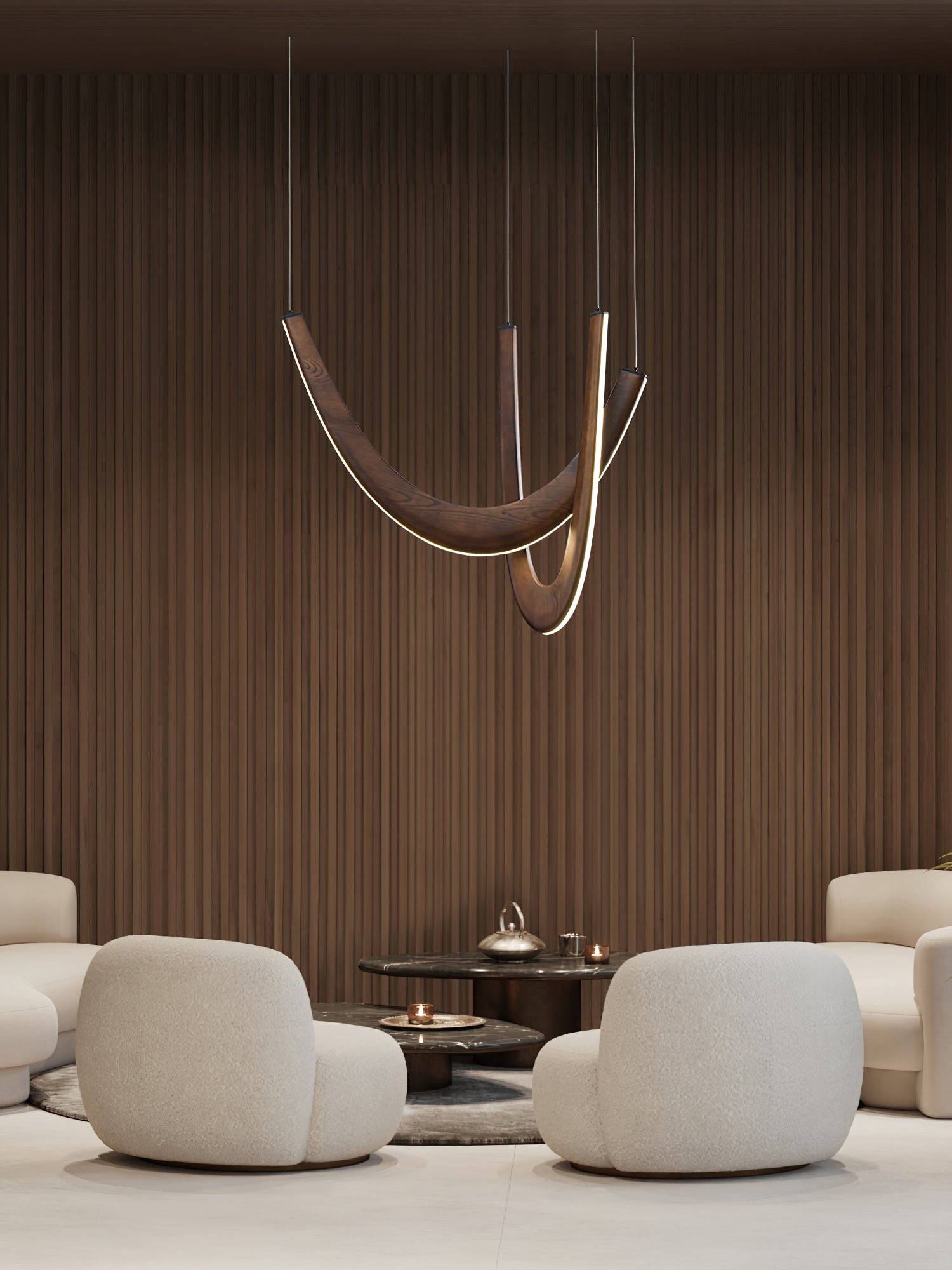 As an expert in lighting and design, I present the U Wooden Pendant Lamp. Crafted from a combination of two overlapping U-shaped wooden frames, this lamp adds a unique and modern touch to any space. The intertwining design provides functional light and artistic value, making it a must-have piece for any home or office.