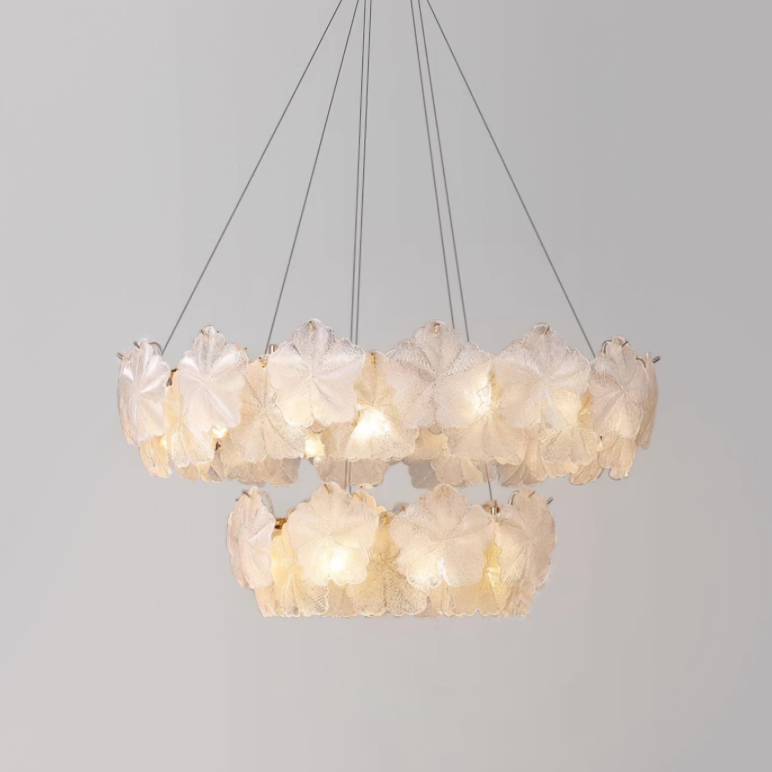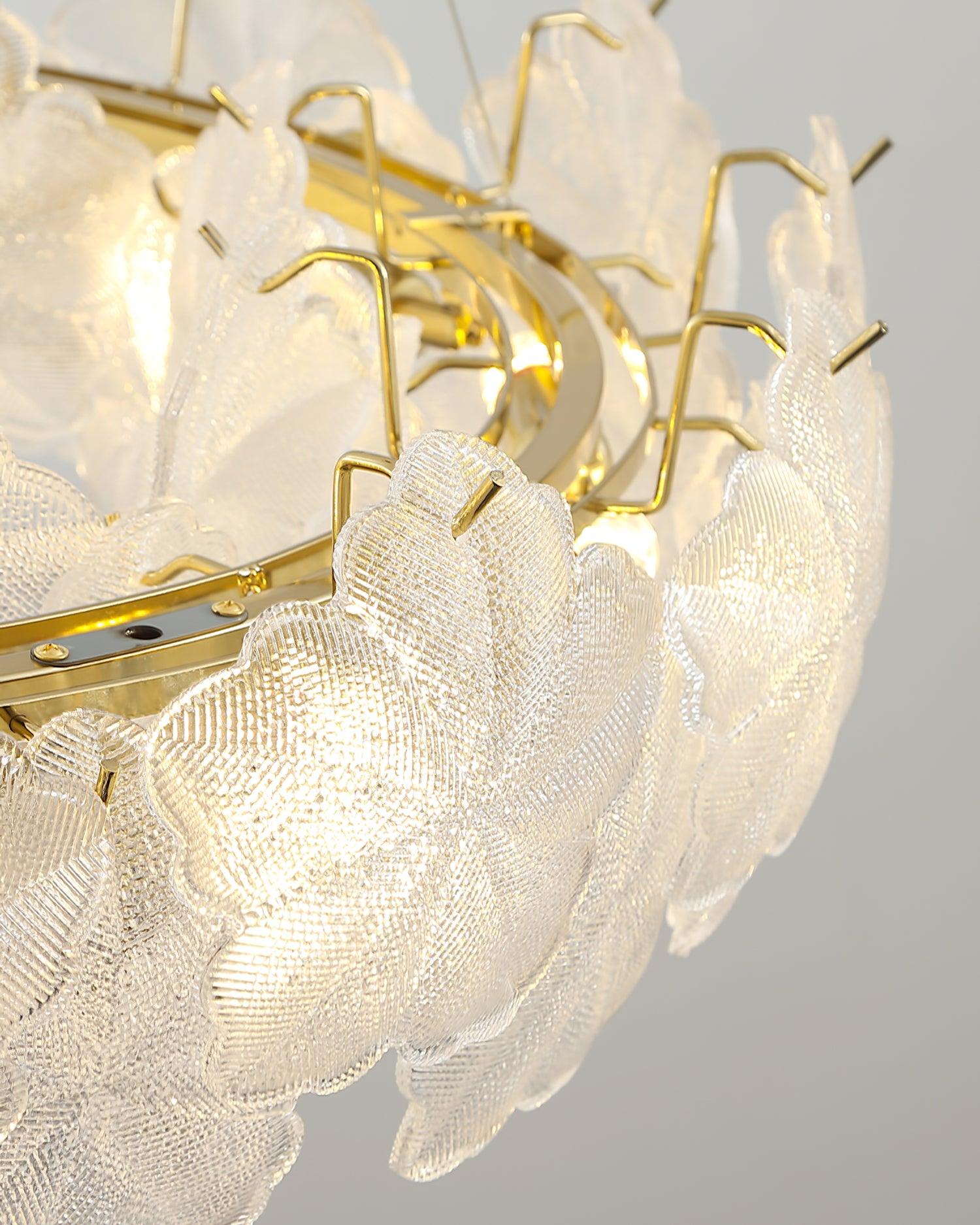 Elevate the ambiance of any room in your home with the Valery Chandelier, a symbol of sophistication and refined taste. Its crystal-clear lines and the gentle cascade of light, diffused through delicate glass petal-shaped blades, offer an opulent and luxurious atmosphere, inviting you to revel in its exquisite aura.