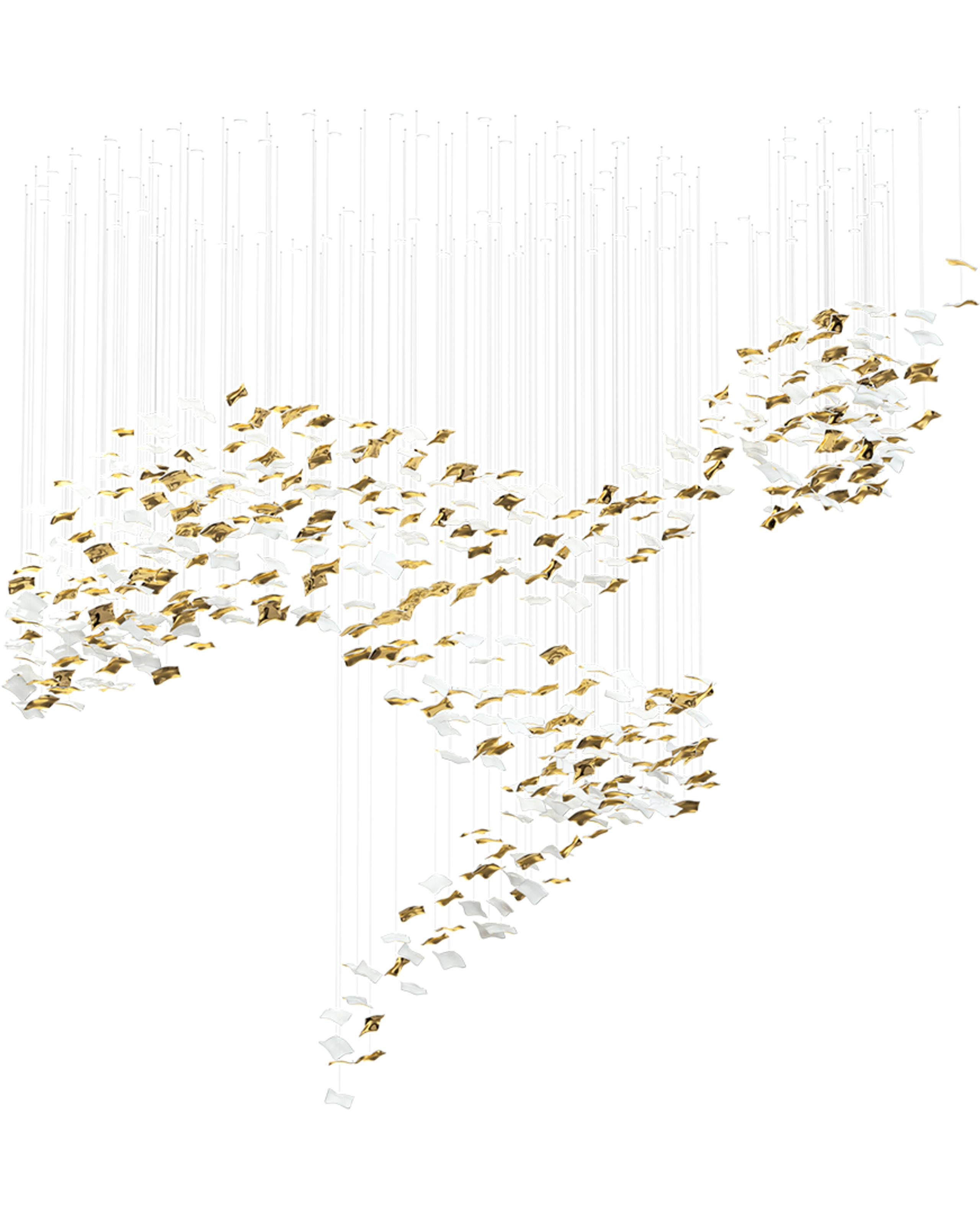 The Whispering Kerchiefs Collection captures the delicate beauty of kerchiefs caught in a gentle breeze, effortlessly elevating your decor with a touch of elegance. Each hand-blown opal glass piece floats gracefully, creating a sense of lightness that enchants any space. The contrasting metal finish adds a bold accent, enhancing the refined aesthetic of the design. Perfect as a captivating focal point, the Whispering Kerchiefs Collection brings a stylish and sophisticated ambiance, transforming interiors with its graceful form and artful craftsmanship.